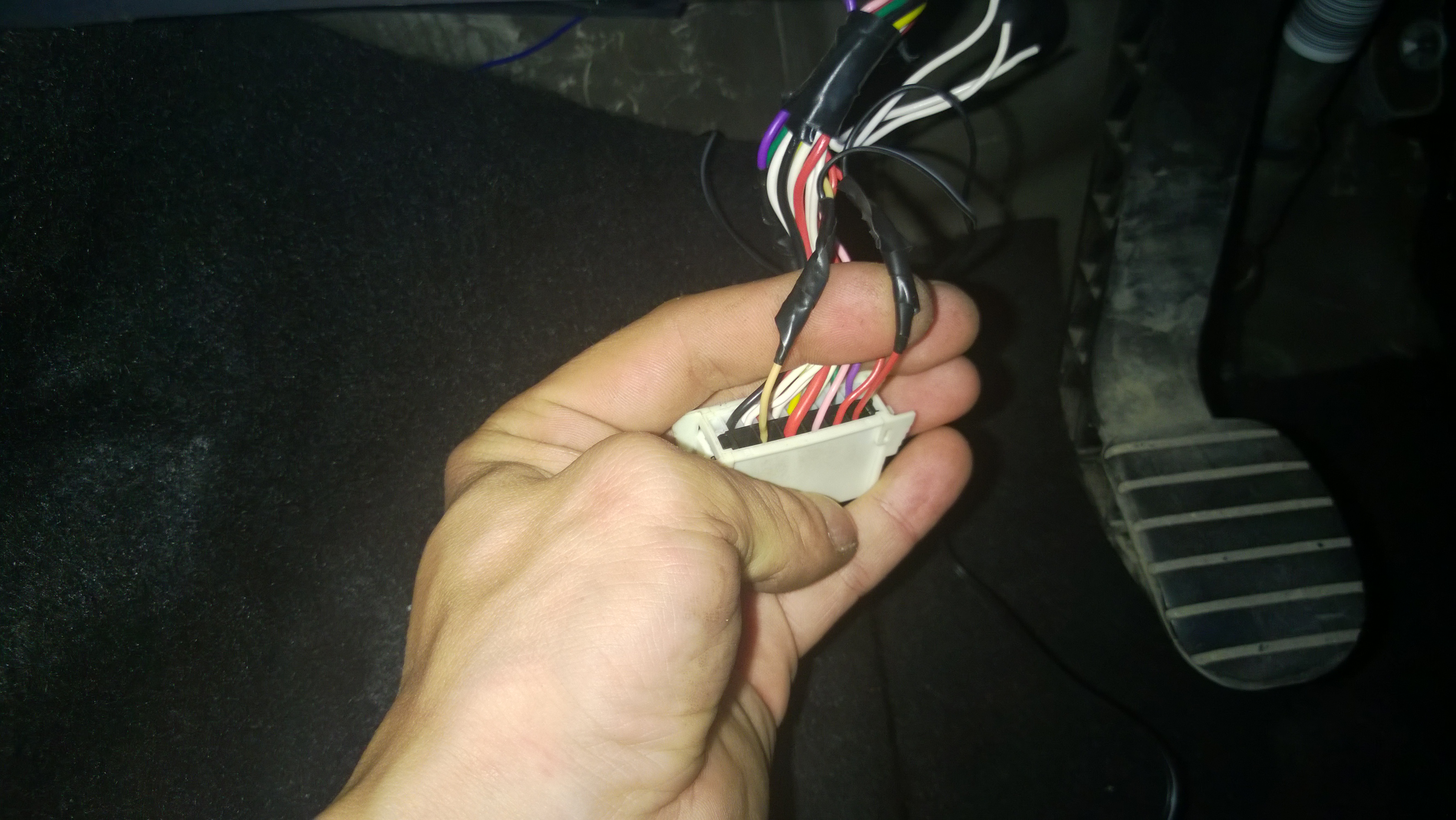 Белый большой разъем, только уже не помню где плюс, а где минус (два провода на фото отведены в сторону, красный и бежевый)
