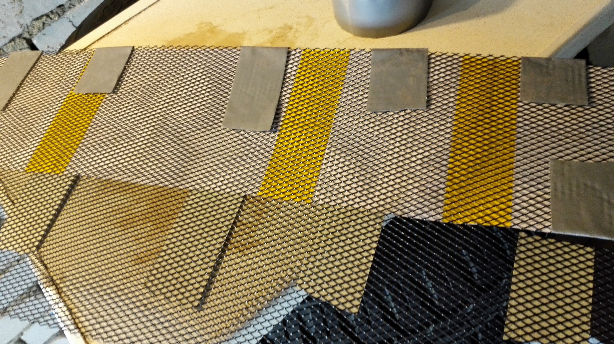Широко известные 4-х диодные Narva (а-ля филипс) лежали уже давно, т.к. никак не придумал, как аккуратно приколхозить их кронштейн в решетку. Наконец решился, вместе с установкой сетки. Выпилил по 2 крайние вертикальные перемычки решетки, вдавил внутрь крепление. Выглядит не очень, но сверху собираюсь прикрыть все сеткой, так что колхоз не будет сильно заметен. Через верхние отверстия притянул стяжками (фиксируют крепления от уползания внутрь), в нижние отверстия вставил саморезы, шляпками внутрь кронштейна. Предварительно в нижней планке решетки дремелем выпилил под них пазы шириной и глубиной по диаметру самореза . Саморезы удерживают кронштейны от выползания наружу. На фото саморезов еще нет, там просто видно нижные отверстия. (эта идея пришла немного позже- разрезал стяжки, выпилил пазы, поставил саморезы и собрал все обратно). Конструкция получилась достаточно опрятная и прочная. Верхняя кромка кронштейна стоит на уровне кромки решетки, нижняя выступает где-то на 1.5 мм (чуть меньше, чем на фото). С учетом небольшого наклона решетки вниз, лампы будут стоять практически горизонтально. Линзы диодов внутри лампы направлены немного вверх. До установки креплений протянул через них провод от ламп и провел его протяжкой из проволоки между радиатором и фарой в район аккумулятора. Защелкнул лампы в кронштейны, подключил, все ок. Верхние сетки. Ничего особенного, действовал по описанию Сергея valese из клубного FAQ-а. Размер 250х370 мм 2 штуки, открутил 4 торкса на 30, оттянул декоративную решетку радиатора вперед (чуть приподнять и снять ее с двух штырьков). Отгибается достаточно легко, ничего не трещит и не отламывается. Верхний край при этом отошел где-то сантиметра на 4 вперед. Вложил сетки, выровнял, прикрутил решетку. Нижние сетки. Напечатал шаблон на 4 листах А4, совместил по крестикам, по стыкам склеил скотчем с двух сторон. Наклеил скотчем шаблон на сетку (покупал их 2 штуки 30х100 см). Начал вырезать. По мере срезания полоски скотча, останавливался и проклеивал еще раз скотчем, уже оборачивая его на другую сторону вырезанной части сетки. Таким образом, отсутствовали возможные смещения шаблона в процессе. При резке сетки прошу беречь глаза (могут отскакивать мелкие части проволоки при подрезке закруглений), пальцы и верхнюю одежду (колючая) ![]() Не совсем понятен смысл небольшого искривления (выемки) в нижней части шаблона, но поскольку сначала сделал, а потом подумал, то вышло тоже с этим изгибом. Мне кажется, можно низ было оставить просто прямым. По месту сделал вырезы под ДХО. Дальше самое интересное, крепление стяжками. Решил крепить к вертикальным элементам решетки, начиная от центра и в стороны через одну. Ближе к краям порядок нарушил, сдвинул поближе к краю. Протягивал стяжки по одной, слегка наживляя на несколько щелчков. Для каждой следующей стяжки прикладываем сетку вплотную к решетке, выбираем нужные отверстия, заводим стяжку от себя внутрь, огибаем решетку, вытягиваем наружу и выводим через соседнее отверстие сетки, слегка защелкиваем. И т.д. После наживления всех стяжек, прижимаем сетку и аккуратно затягиваем стяжки. Советую заранее хорошенько проверить стяжки на эластичность, у меня 2 сломались, пришлось на их место поставить проволоку в черной изоляции - для прокладки новой стяжки уже не подлезть. Впрочем, проволока получилась еще мен