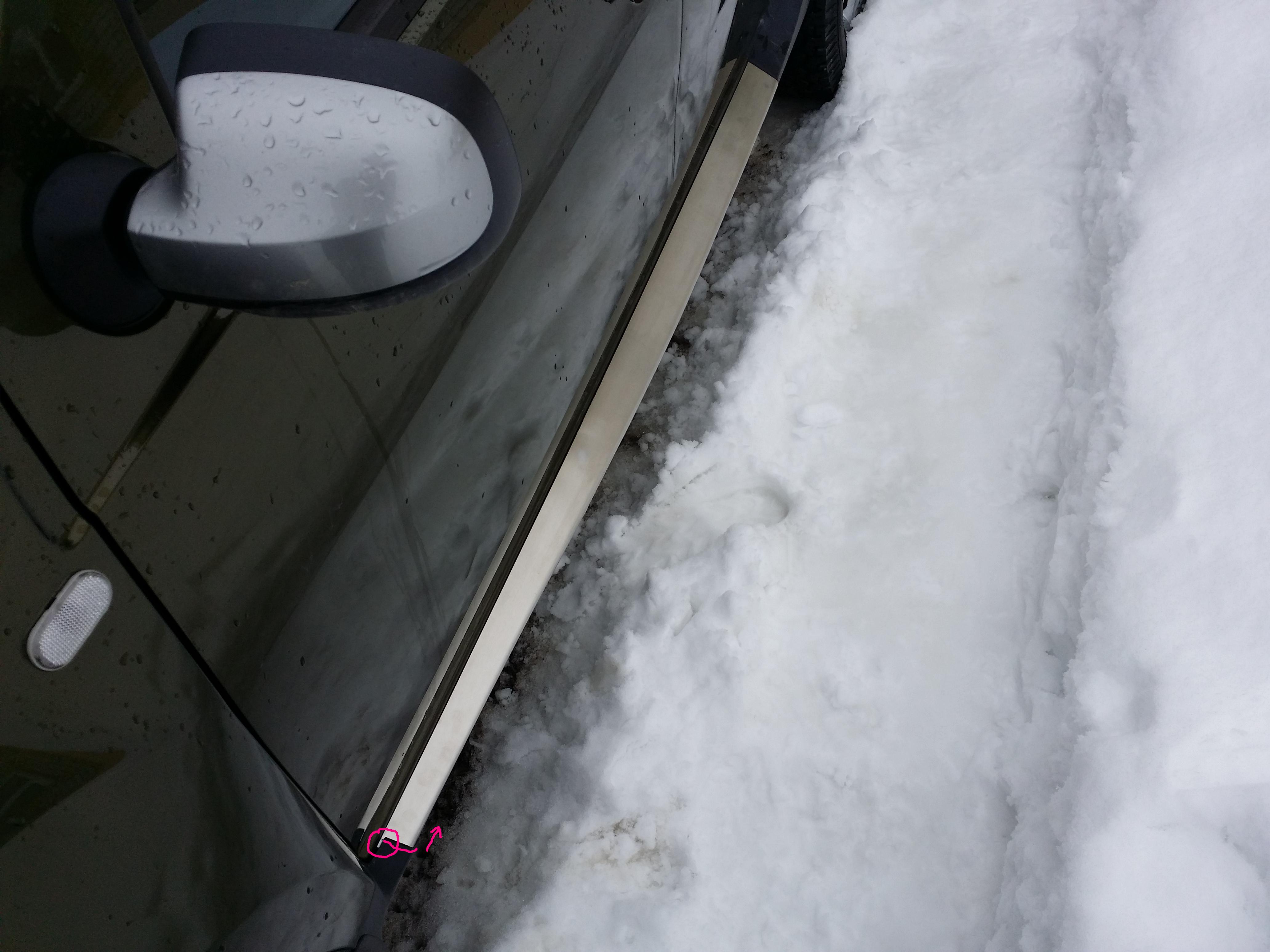 Здесь могут быть несколько моментов. Изменения по кузову при сборке,крыло устанавливается на болтах.. Ошибка длинны накладки....после "пробных", говорили увеличили... Посадка пластиковой угловой заглушки спереди порога,ее неплотная посадка к арке крыла кузова (например из-за установки брызговика часто закладные под винт выпадают).. Заход(глубина) штатного пластика накладки под эту часть(имеется небольшой продольный люфт вперед\назад в ответных пазах для защелок при установки накладок).