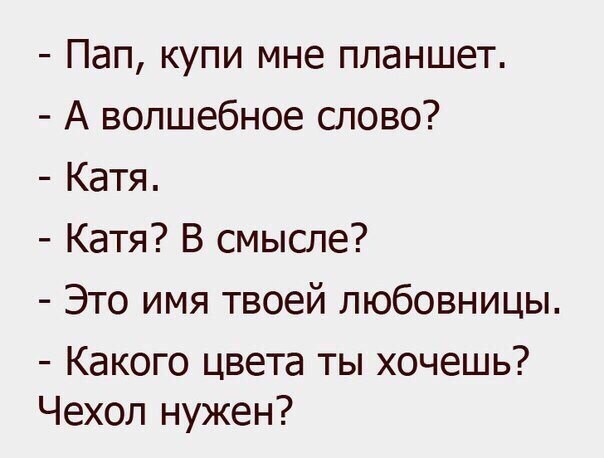 Про девочек говорили - им шмотки нужно покупать, куклы, шмотки для кукол, косметику, косметику для кукол... Зато едят - ложку Активии на обед. Мальчик, вроде, одной паре джинс рад и привет, но вот жрёт, как кабан. - Неееее, смотри шире. На парне в детстве все шмотки горят - сплошные траты... Потом он подрос - покупай ему велосипед, потом мопед, потом отмазывай от армии, потом покупай квартиру - чтоб жениться смог.... - И при этом он всё время жрёт, как кабан. ------ Сегодня захожу в магазин и говорю без задней мысли:" Дайте четыре "Три богатыря" и две "Три корочки хлеба". А потом несколько минут втыкал на продавца, который, видимо, пытался посчитать сколько и чего мне нужно. ------ У сестрёнки DVD сломался. Починили, но показывает в ч/б. Так вот картина: Cидит малой - её сын (3 года), смотрит обучающий DVD для детей. - Дети, какого цвета этот круг? - Чёрный! - почти в истерике. - Молодцы, красный. - А какого цвета этот квадрат? - Чёрный!!!!!!!!! - плачет. - Правильно, дети, синий! ----- - Хочешь стих? - Хочу. - Я помню чудное мгновенье: Передо мной явилась ты, Как мимолётное виденье, Как гений чистой красоты. - Как красиво... Ты такой милый, ради меня ещё никто стихов не сочинял... - Ну, я шокирован... Знаешь, меня сегодня прёт, я тебе сейчас столько стихов насочиняю. ----- - К вопросу об офисной скуке: Берётся степлер, на нём рисуются глаза и имя (например, "Мегазол"), ставится на аккуратную тряпочку для протирки очков. На неё же ставится пивная пробка с водой и другая, с мелко порванной бумагой. Способ использования: во время выслушивания очередного клиента, мрачно глядя в его тупые клиентские глаза, несколько раз погладить степлер по спинке и подвинуть ему пробку с бумагой... |
