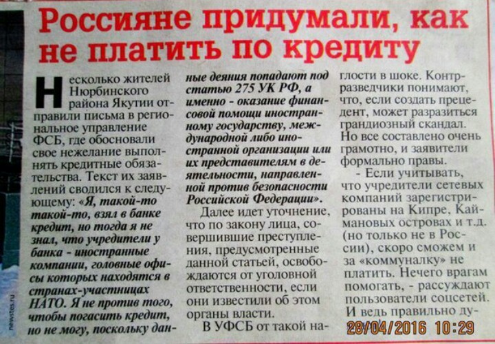 Так ВВП прямо ответил на вопрос присоединившихся крымчан, взявших кредиты в банках Украины:"Можете не платить." 2014 год. Последний раз редактировалось Дмитрий Сталь; 24.12.2016 в 00:48. |