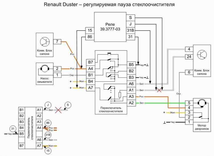 На Рено Дастер 2017 года управление тактами стеклоочистителя, в положении «2» рычага переключателя передних стеклоочистителей, осуществляется подачей «минуса» на коммутационный блок салона, а не «плюса» как в предыдущих версиях, описанных в данной теме. Он подключается по белому проводу на гнезде №8 разъема. Поэтому для работы схемы с реле 722.3777-01 или аналогичны на контакт «J» реле необходимо подавать «+» через дополнительное реле. Остальная часть схемы подключения не меняется.