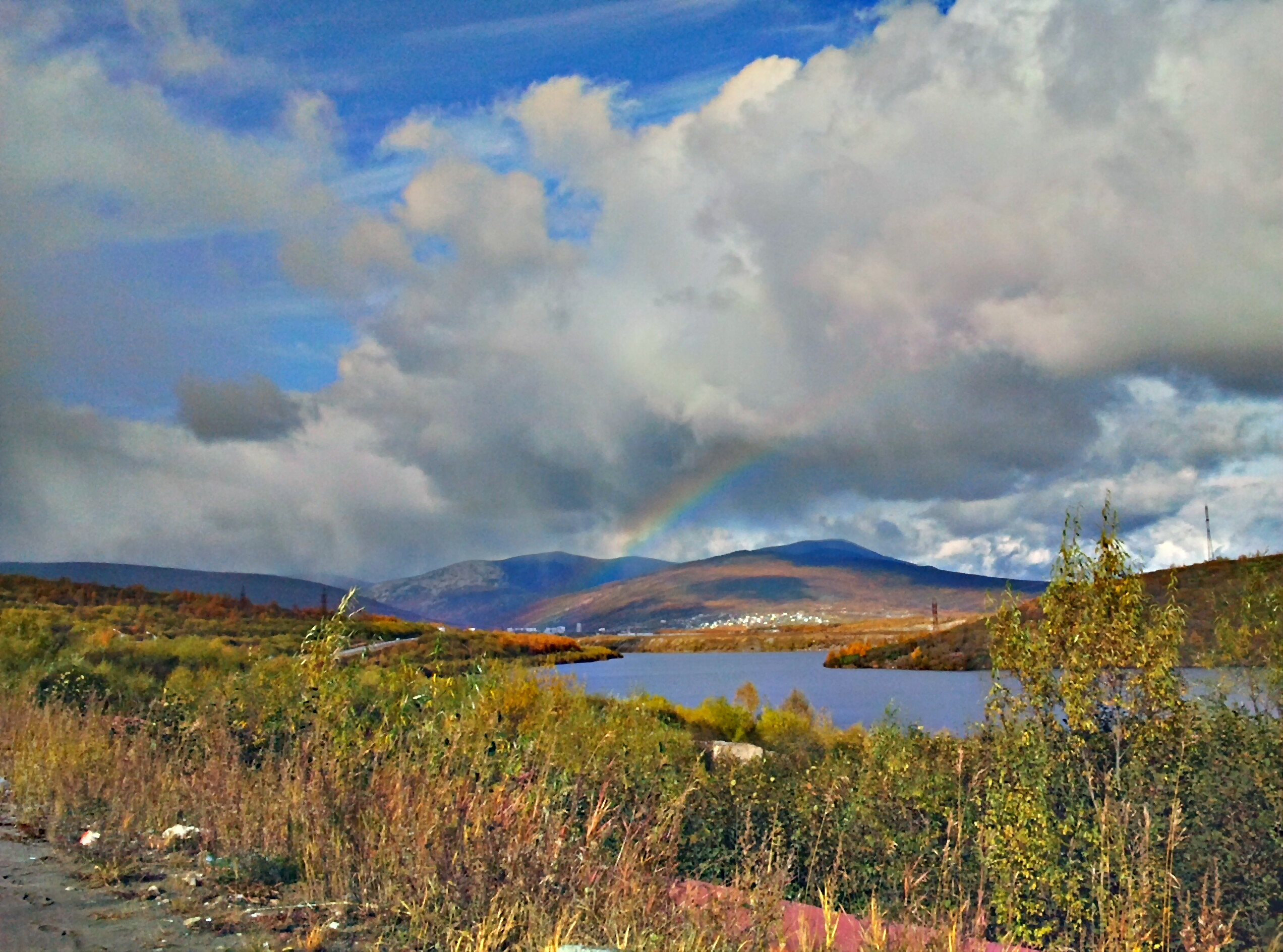 Осень, радуга и гдето там виднеется микрорайон Солнечный. Озеро-не озеро, это техническое водохранилище. Фотал на телефонку. |