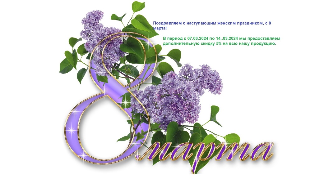 В период с 07.03.2024 по 14.03.2024 мы предоставляем дополнительную скидку 5% на всю нашу продукцию. |