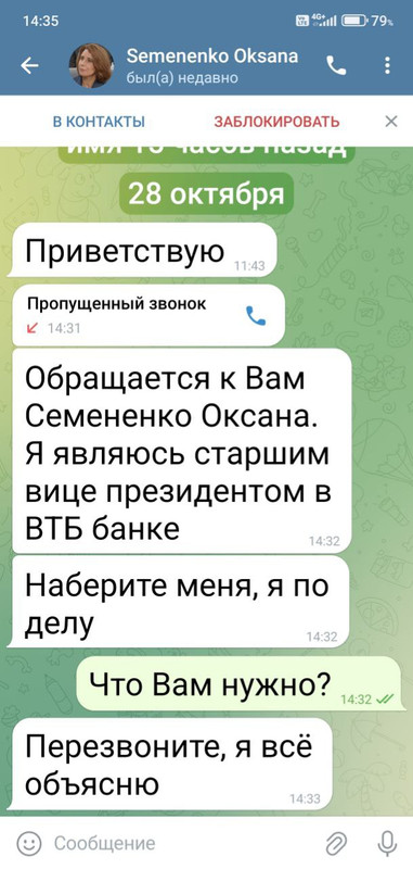 Сегодня со мной пыталась выйти на связь лично вице-президент ВТБ, правда почему-то через телегу