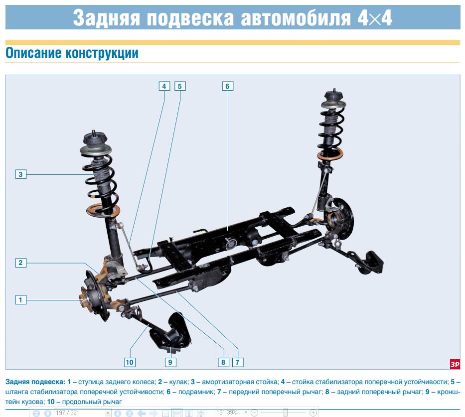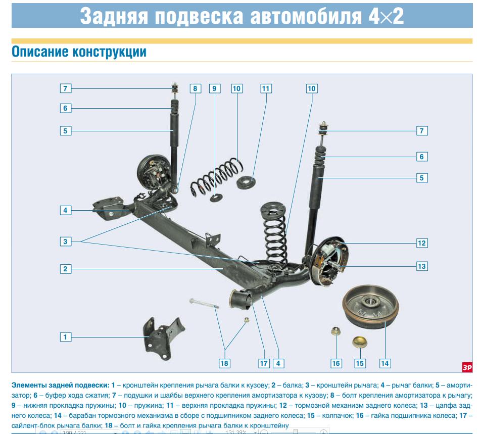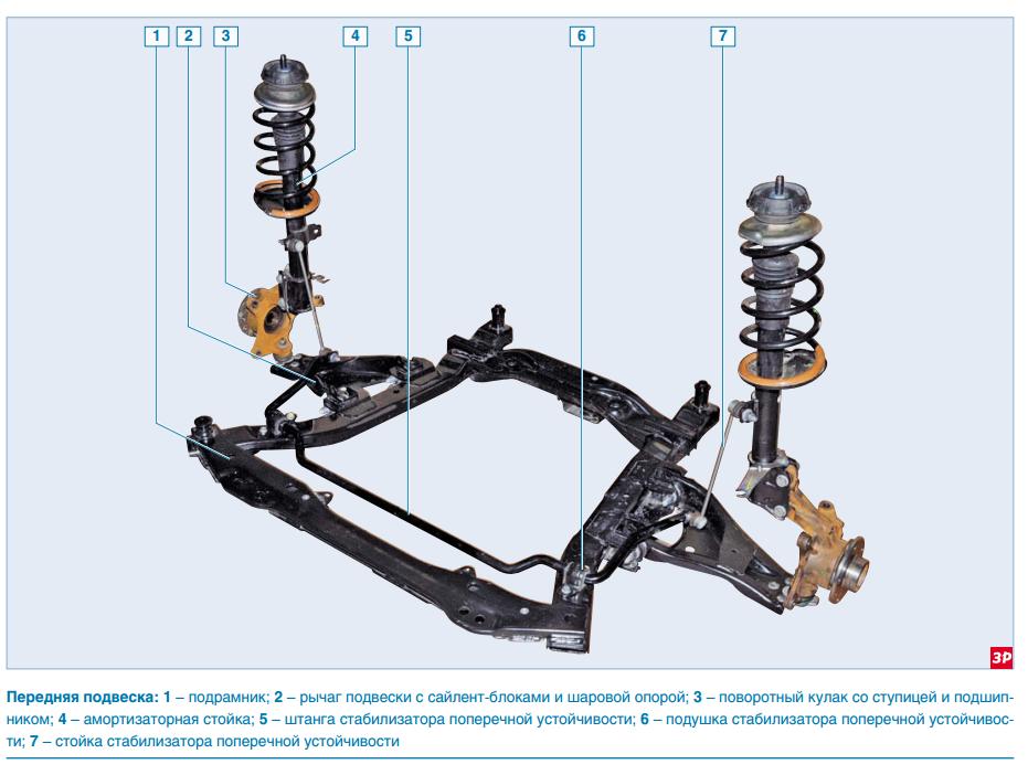 Передняя подвеска независимая, типа Мак-Ферсон с поперечными рычага-ми треугольной формы и стабилизатором поперечной устойчивости. Основа подвески – телескопическая амортизаторная стойка, кото-рая позволяет колесам перемещаться вверх-вниз при проезде неровностей и одновременно гасить колебания кузова. Снизу стойка крепится двумя болтами с гайками к поворотному кулаку, а сверху – гайкой через резино-металлическую опору к кузову. Для эффективного гашения колебаний кузова и улучшения управля-емости и устойчивости автомобиля в корпусе стойки установлен двухтрубный газонаполненный амор-тизатор, имеющий более высокие характеристики, чем обычный гид-равлический амортизатор. К сред-ней части корпуса стойки приварена нижняя опорная чашка пружины, а к нижней части стойки – кронш-тейн для крепления к поворотному кулаку. На штоке амортизатора установлен буфер хода сжатия, выполненный заодно с защитным чехлом. Сверху пружина упирается в верхнюю опор-ную чашку, установленную на штоке амортизатора. Между верхней чаш-кой пружины и верхней опорой стой-ки установлен упорный подшипник, позволяющий корпусу стойки по-ворачиваться вместе с пружиной, а штоку амортизатора оставаться не-подвижным. Тормозные и тяговые силы при дви-жении автомобиля воспринимаются рычагами подвески, соединенными через шаровые опоры с поворотными кулаками и через сайлент-блоки – с подрамником передней подвески. Подрамник жестко крепится к кузову четырьмя болтами. Корпус шаровой опоры приклепан к рычагу подвески. Шарнир опоры защищен резиновым чехлом. Палец шарового шарнира опоры вставлен в коническую проушину поворотно-го кулака и закреплен гайкой. В отверстие поворотного кулака за-прессован двухрядный шариковый радиально-упорный подшипник за-крытого типа, а ступица колеса за-прессована во внутренние кольца подшипника. Внутренние кольца подшипника стягиваются (через ступицу) гайкой на резьбовой части хвостовика корпуса наружного шарнира привода колес. Гайки подшипников ступиц одинаковые с правой резьбой. В процессе эксплуатации подшипник не требует обслуживания и не ре-гулируется. Штанга стабилизатора изготовле-на из пружинной стали. Штанга крепится к подрамнику скобами через резиновые подушки. Оба конца штанги соединяются с амортизатор-ными стойками через стойки стабилизатора. Стойка стабилизатора представляет собой стальной стержень с двумя шаровыми шарнирами с обеих сторон. Угол продольного наклона оси по-ворота переднего колеса и угол раз-вала колеса заданы конструктивно и не регулируются. Эти углы можно лишь проверить на специальном стенде (на станции технического обслуживания) и сравнить с контрольными значениями. В том случае, если значения углов установки передних колес не соответствуют норме, необходимо проверить со-стояние элементов передней подвески. Задняя подвеска – независимая, многорычажная c цилиндрическими витыми пружинами и телескопичес-кими амортизаторными стойками, служащими для гашения колебаний, поглощения толчков и ударов, дейс-твующих на кузов автомобиля через его колеса. Амортизаторные стойки включают в себя упругие элементы – пружи-ны, которые предотвращают от-рыв колес от дороги, обеспечивая постоянное сцепление с дорогой. Амортизаторы стоек препятствуют колебаниям кузова, что соответс-твенно сказы