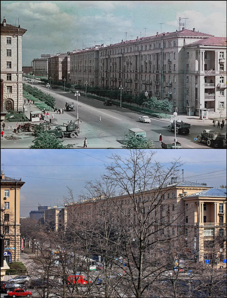 Попытка совместить время и пространство. Экспозиция в 46 лет. Вверху скан с пленки (снимал тесть, разрешение на публикацию получено), снизу мой снимок. (С-Петербург, пр. Стачек.) |