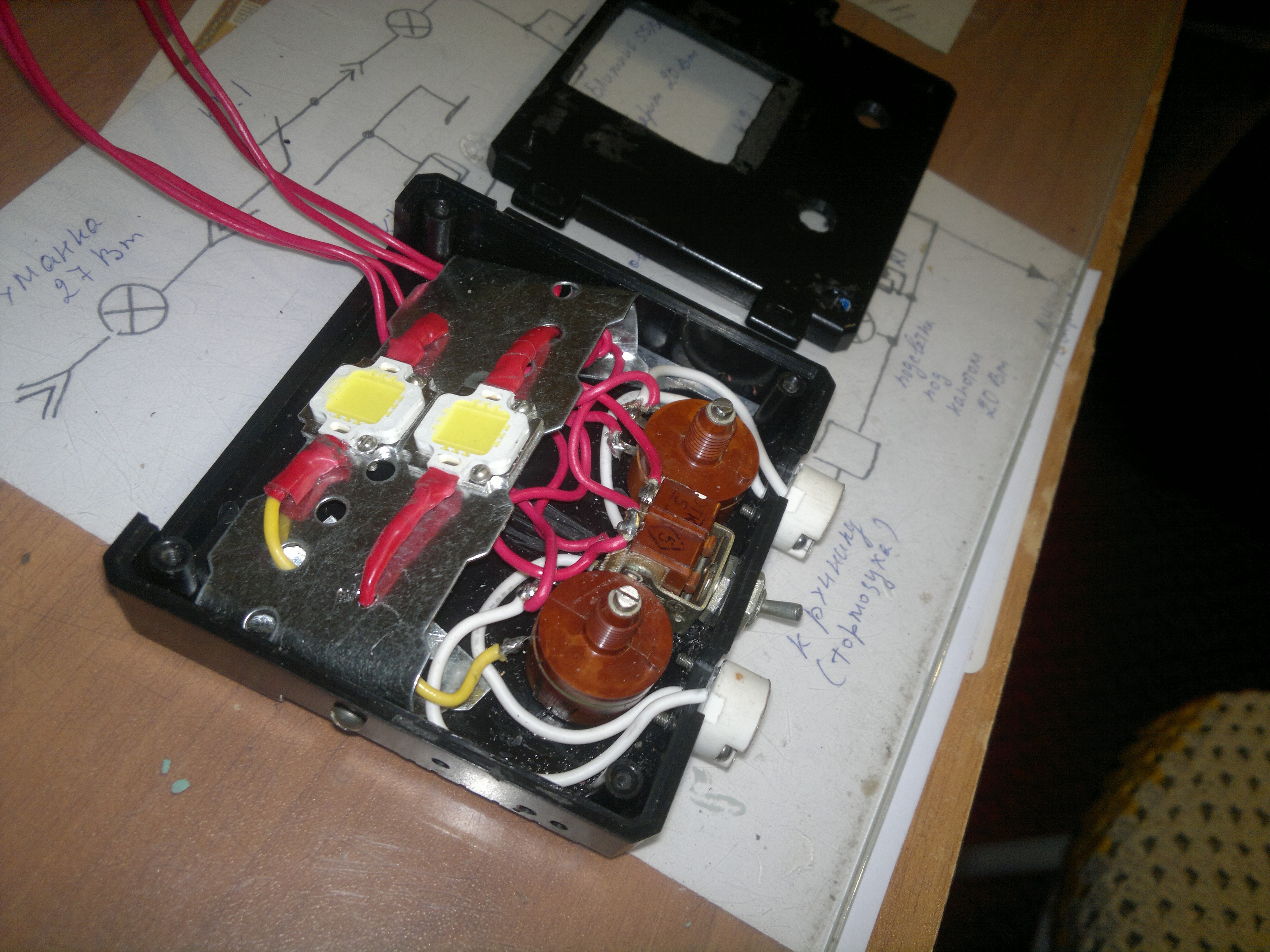 Да и вся конструкция у меня спаяна таким образом, что корпус будет приклеиваться к капоту вверх ногами, а крышка с ушами креплений может откручиваться от приблуды саморезами сколько угодно раз.( на случай замены светодиодов . Больше там нечему сгорать.