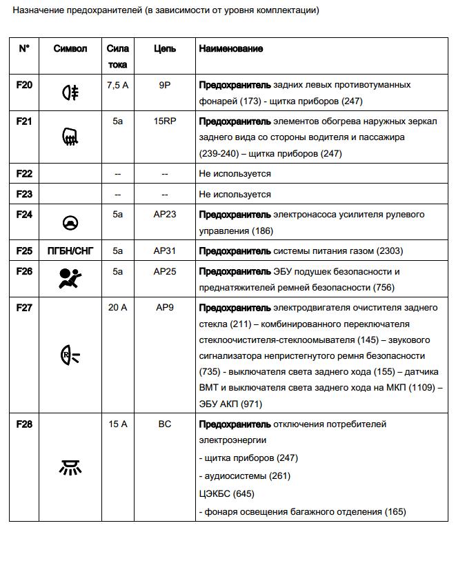 Данные взяты из Электросхемы Dacia Duster ps На фото есть косячек... Не указаны некоторые предохранители. Для тех машин, у которых на крышке блока предохранителей нет обозначения, можно распечатать и вклеить бумажный вариант. За предоставленный файл поблагодарим нашего коллегу-террановода Dima_Tr с дружественного ресурса http://terrano-club.ru/threads/blok-...e-7#post-34693