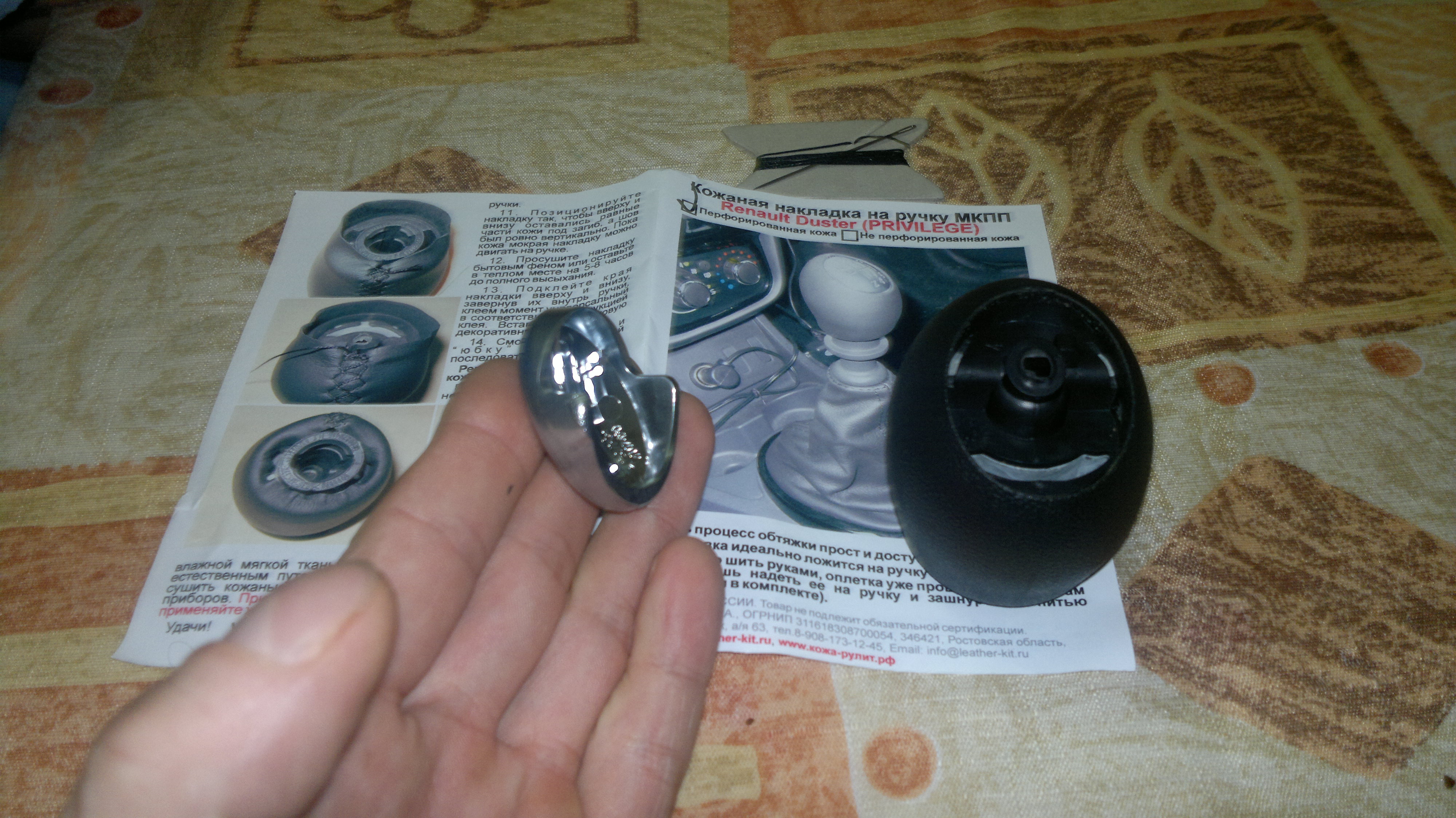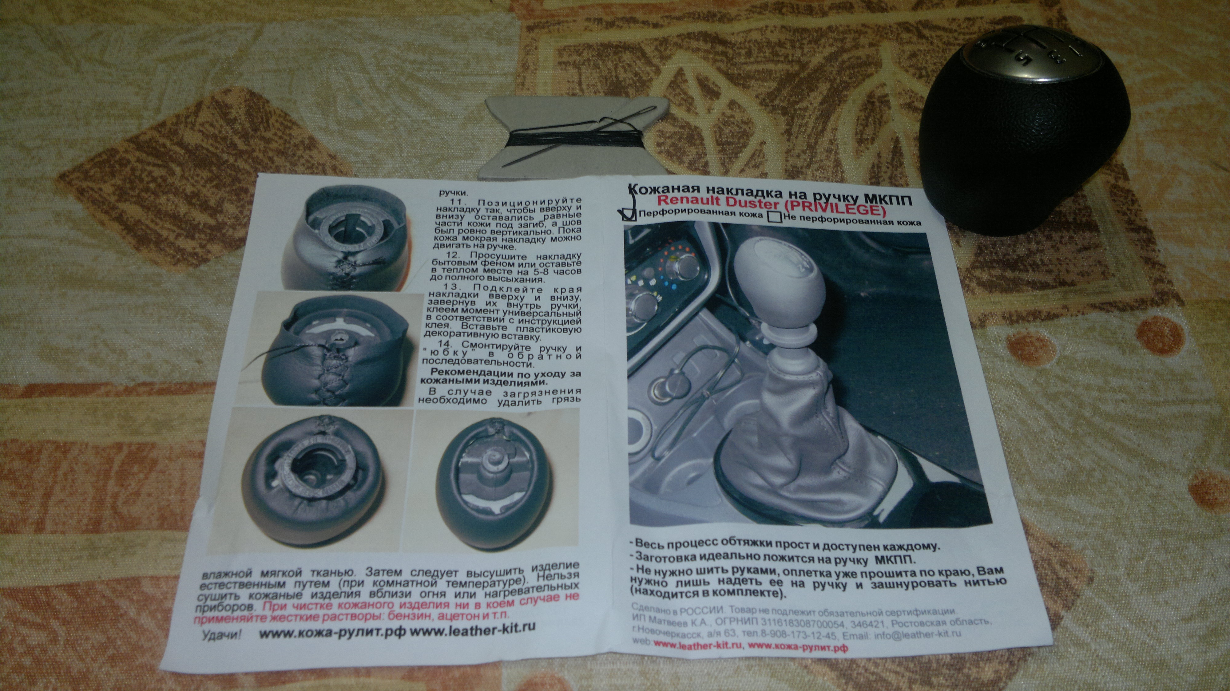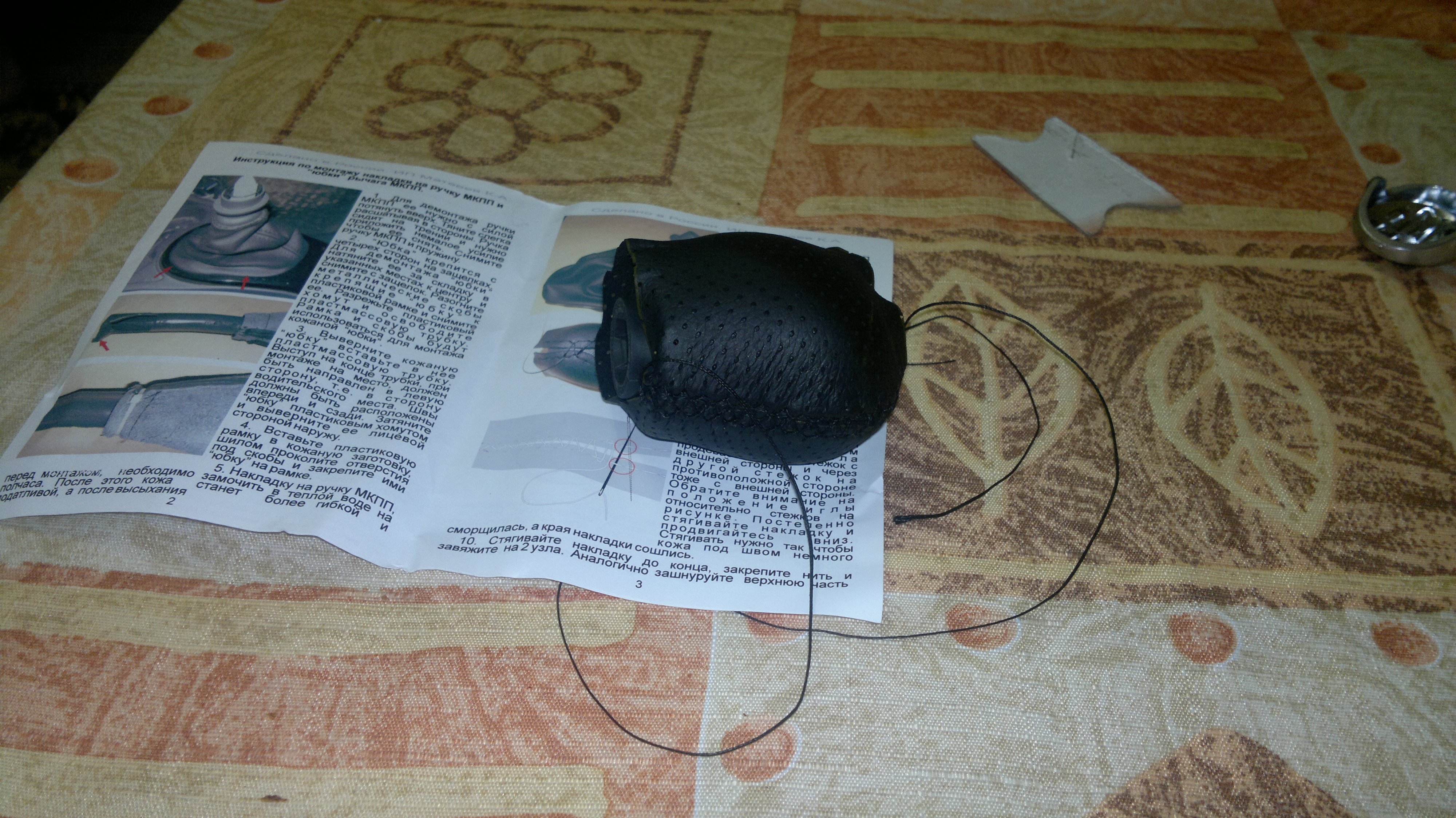В комплекте с накладкой приложена "юбка", нитка для шнурования, игла и инструкция... Снимаем ручку КПП. Снимается с усилием слегка расшатывая в стороны. С ручкой направляемся домой. Дома предварительно замачиваем накладку в теплой воде. Снимаем хромированную накладку аккуратно поддев ее с краю Приступаем к шнурованию... После просушки торцов бытовым феном проклеиваем и возвращаем на место серебристую накладку Рукоять готова, приступаем к замене манжеты. Снимаем пружину. Аккуратно надавив на бока снимаем манжету Выворачиваем и срезаем пластиковую стяжку Одеваем манжету из комплекта и стягиваем в монтажном месте пластиковой стяжкой из комплекта. Обрезаем лишний конец стяжки... Снимаем пластиковую рамку со штатной манжеты разогнув металлические скобки Манжету из комплекта натягиваем на пластиковую рамку и крепим металлическими скобками собираем все в обратной последовательности (не забываем вложить пружинку) Если вдруг найдутся желающие самостоятельно изготовить накладку во вложениях эскиз 1:1