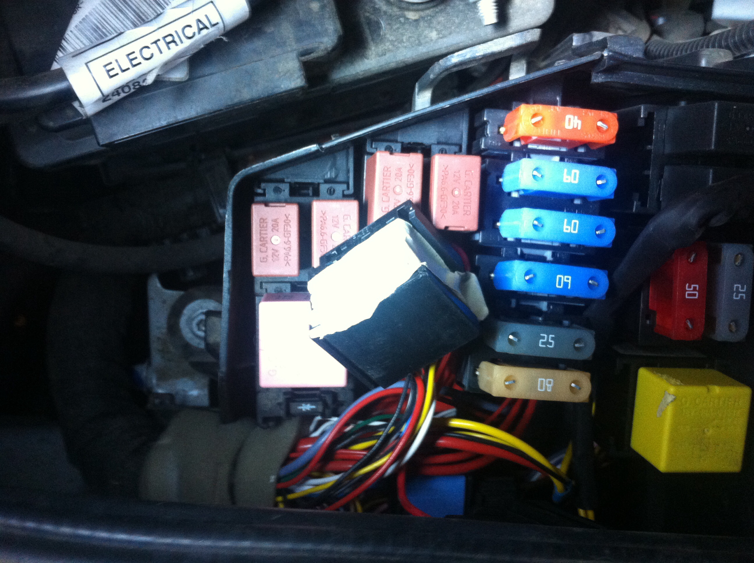 Если на фару приходят 6 проводов, значит колодка в блоке есть. Попробуй отстегнуть колодки предохранителей (сами предохранители из колодки не выталкивать!) и приподнять их вверх вместе с проводами. Под этими проводами и лежит колодка для ДХО. Все колодки в блоке крепятся на защёлках, просто при сборке её не пристёгивают и убирают вниз. У меня она была заклеена скотчем, видно на фото.