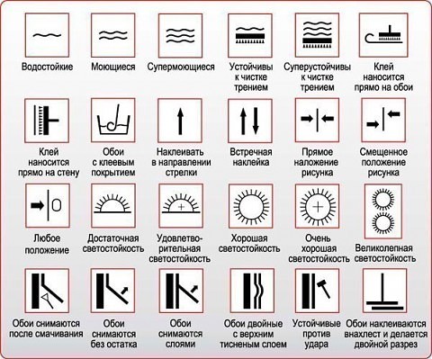 Многие в своих квартирах используют обои и наверное обращали внимание, что и на рулонах с обоями есть листок с информацией и символами, которые иногда не всегда знаем, что означают. Предлагаю Вам таблицу с символами. Надеюсь, что пригодятся Вам во время наклейки обоев.