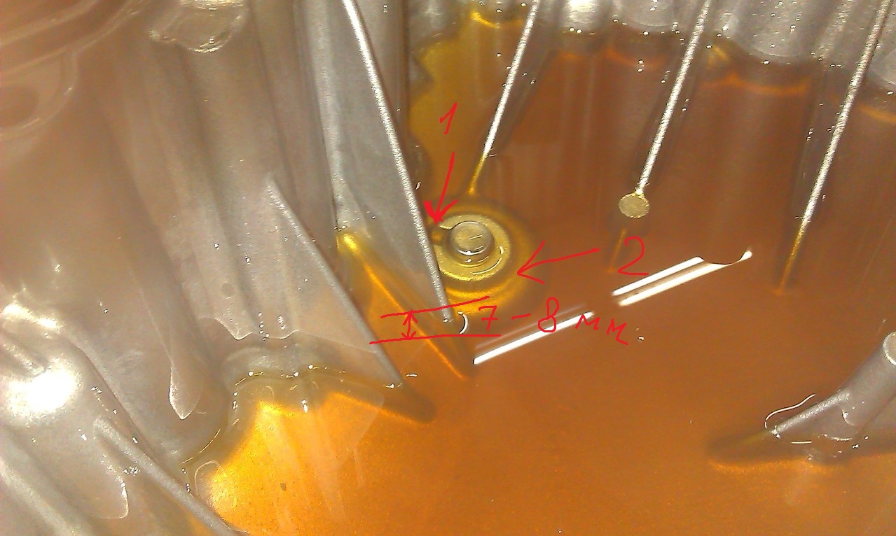 обратите внимание на фото. вот столько почти остается масла в моторе после слива!!! 1. Прорезь чтоб сливалось масло с выступа сливной пробки. 2. Выступ, в него пробка сливная вкручивается. И именно по этот край толщиной 7-8 мм масло уже не сливается. Оно остается в моторе. Обратите внимание на кол-во масла.