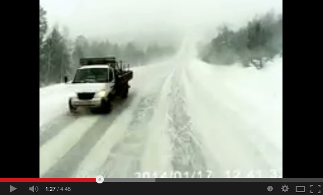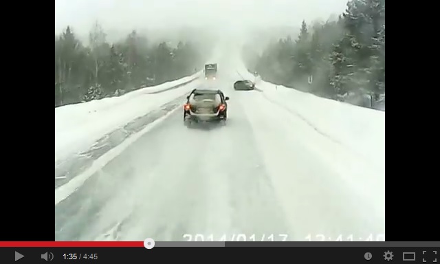 Встречалось мнение, что Тойота пошла на обгон вслепую, но это не так. Вот он, поворот (кто нибудь объяснит мне тупому, почему конец запрета обгона стоит перед поворотом? ):А вот уже за поворотом проходит встречка, после которой Тойота и идет на обгон: А теперь момент начала заноса Жигулей. Тойота находится еще на встречке (только появляется на регистраторе фуры): А через 2 секунды Тойота находится примерно в том месте, где должна была встретиться с Жигуляти, если бы вторые не затормозили: Да, она, вроде, успевала вернуться на свою полосу, но шла на грани фола, чем и спровоцировала роковые действия водителя Жигулей. Вообще на зимней трассе нужен двойной запас для обгона. Если бы Жигули не тормозили, возможно Тойота резче возвращалась на свою полосу и чем бы всё это закончилось на такой дороге - неизвестно.