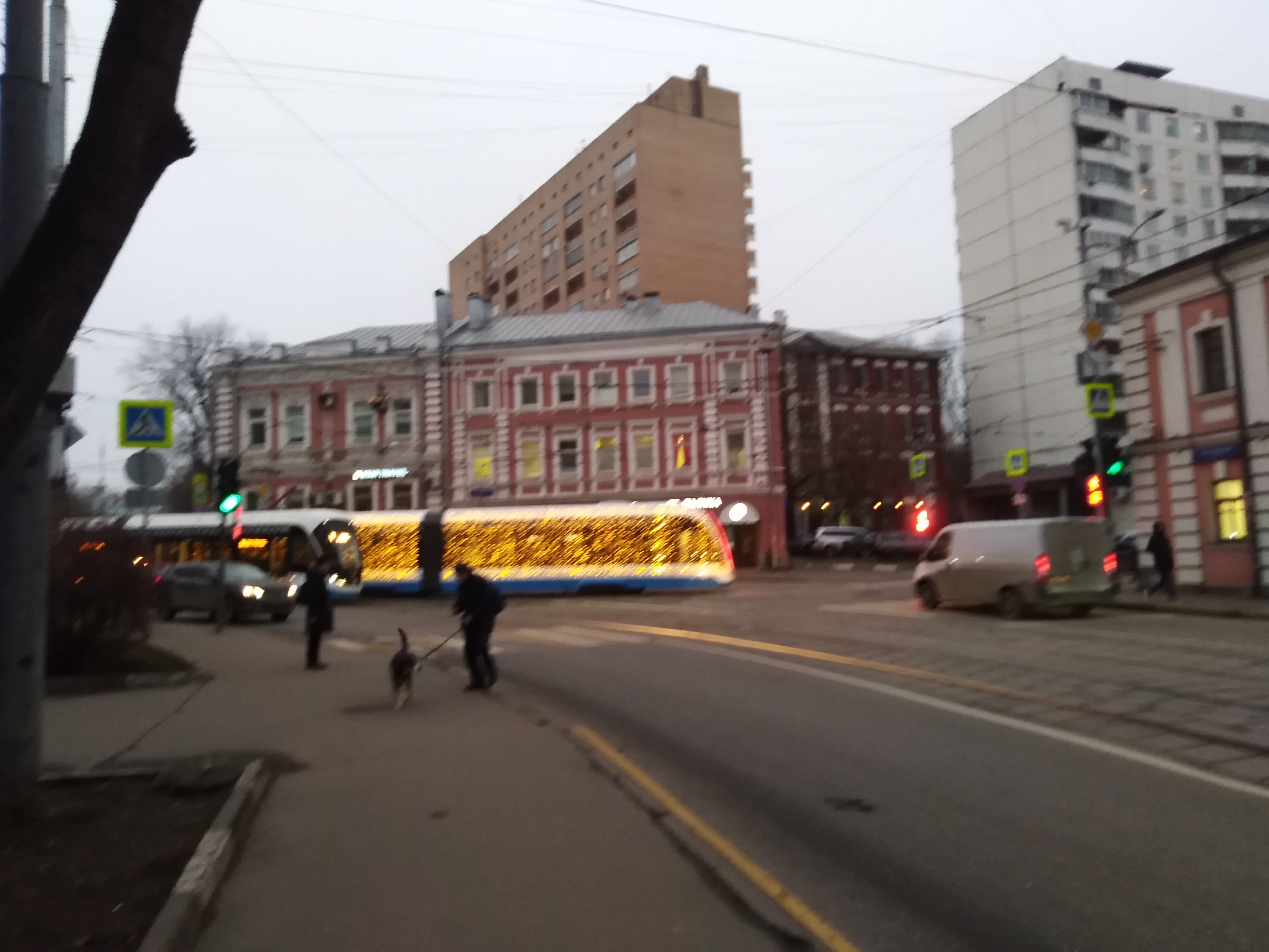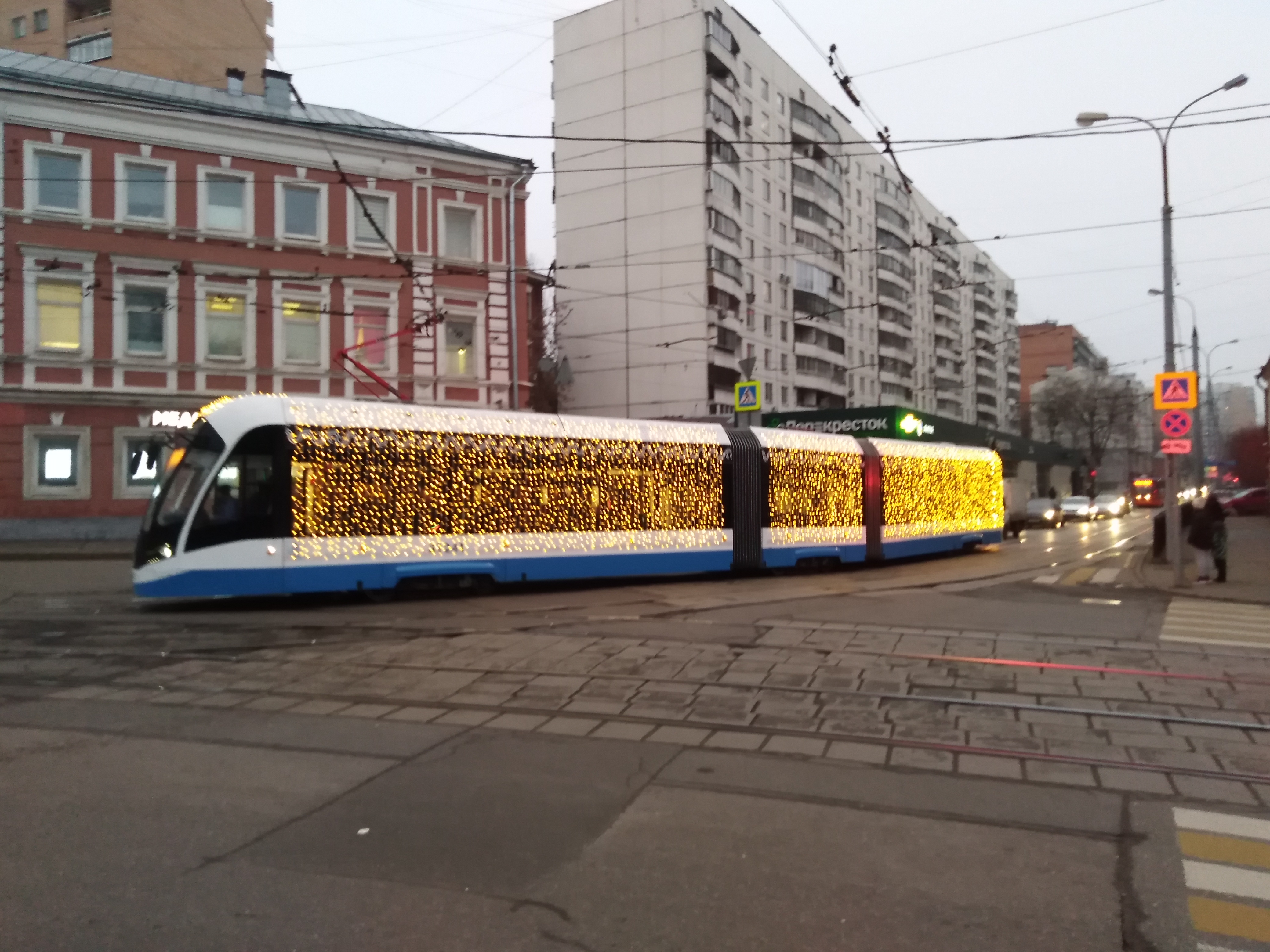 Вчера вечером (в тёмное время суток) видел данный трамвай с лунно-белой подсветкой.