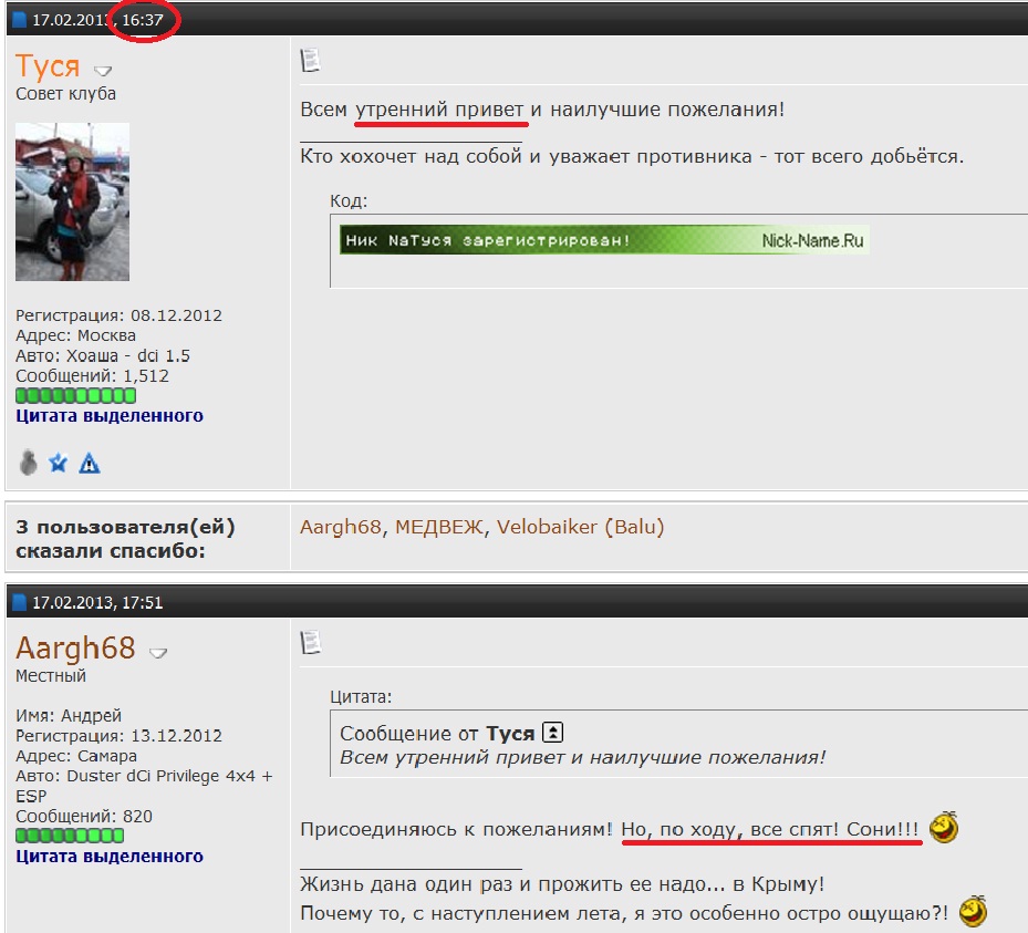 В 6 утра-то... ![]() В общем, надо с перечислением всех форумчан с разбивкой по часовым поясам. ![]() ![]() И Вам прекрасного настроения!