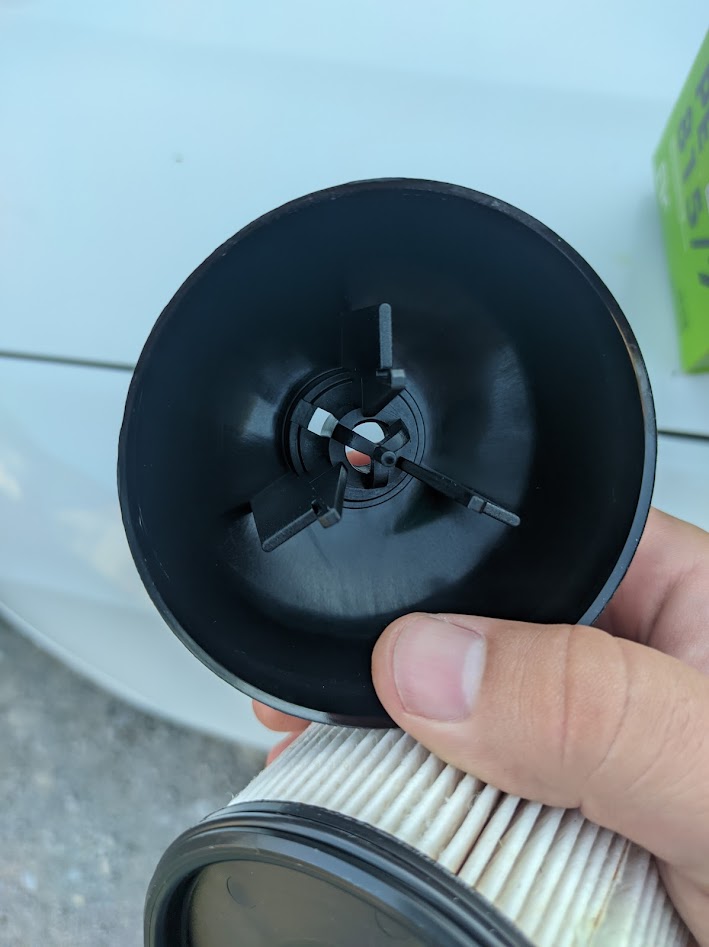 Купил два разных. Дорогой Mahle KX338/28D и дешевый Filtron PE815/7. Смотрю я на них, и не складывается в голове картинка. В моём понимании: Топливо идёт через штуцер подачи на корпусе фильтра (тот, который смещён от центра), и попадает в верхнюю часть емкости корпуса. Там где нагревательный элемент. Далее оно проходит через фильтровальный элемент, и затягивается центральным штуцером. Вне моего понимания: как обеспечивается разграничение областей снаружи и внутри фильтра фильтровального элемента? Сверху уплотнённое соединение картриджа с корпусом фильтра. Но если посмотреть на картридж снизу, там пластиковый кожух. Если посмотреть на сам кожух (см фото во вложении), то помимо резьбы в нём есть перепускное отверстие, через которое, по моему мнению, сообщаются области фильтрованного и нефильтрованного топлива. Отверстие присутствует что у Мале, что у Фильтрона. Уплотнительная резинка на датчике воды герметизирует стык датчика и корпуса фильтра, но не стык корпуса фильтра и картриджа. Где я ошибаюсь? |