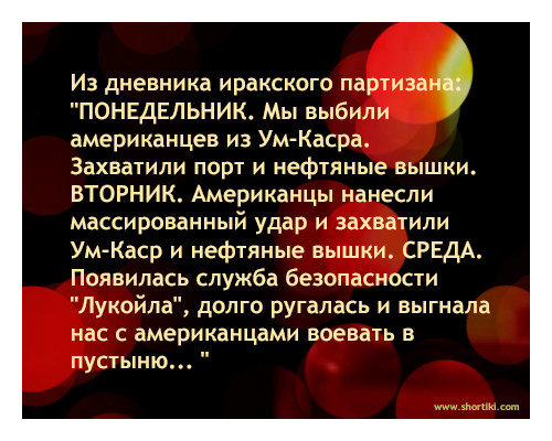 — Ван бир! Официант приносит бокал и подкладывает подставочку под бокал. Через пять минут "наш" : — Ван бир! Официант снова приносит бокал, смотрит, а подставочки нет. Ну, думает, наверное, взял клиент, как сувенир. Достает ещё одну и подкладывает под бокал. Через пять минут "наш" опять: — Ван бир! Официант снова приносит бокал, смотрит — опять подставочки нет. Ну, думает, взял клиент для друга сувенир, достает ещё одну и подкладывает под бокал. Через пять минут "наш" снова: — Ван бир! Официант приносит бокал, смотрит — нет подставочки. Ну, думает, всё, не буду класть подставочку, и ставит бокал на голый стол. "Наш" берёт бокал и с недовольством: — А печенюшку ? ----- С детства ем бутерброды колбасой вниз, потому что Матроскин сказал, что так вкуснее. А у меня нет причин не доверять говорящему коту. |