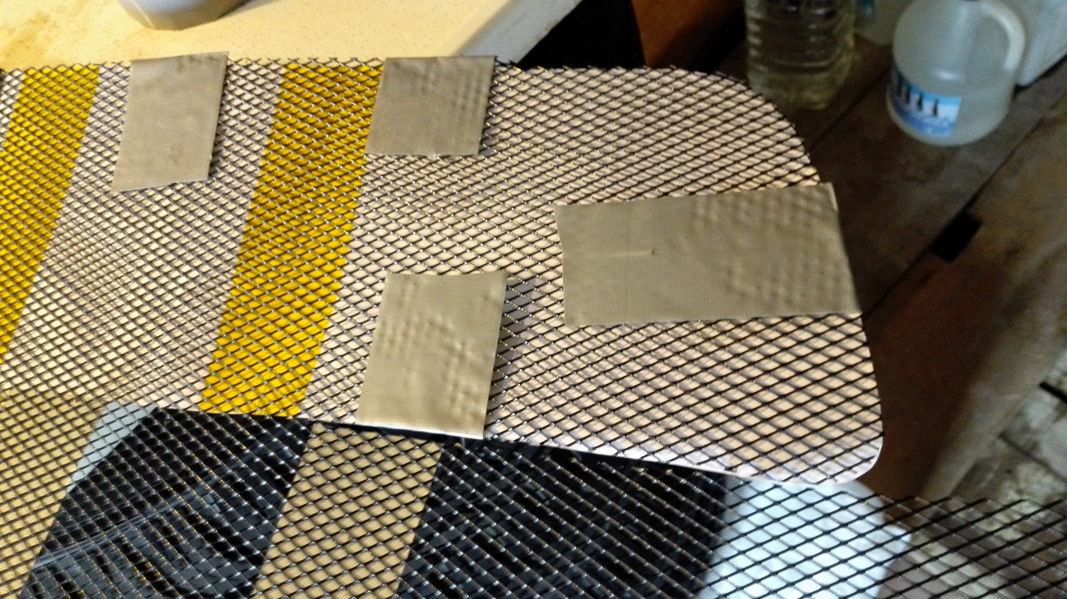 Широко известные 4-х диодные Narva (а-ля филипс) лежали уже давно, т.к. никак не придумал, как аккуратно приколхозить их кронштейн в решетку. Наконец решился, вместе с установкой сетки. Выпилил по 2 крайние вертикальные перемычки решетки, вдавил внутрь крепление. Выглядит не очень, но сверху собираюсь прикрыть все сеткой, так что колхоз не будет сильно заметен. Через верхние отверстия притянул стяжками (фиксируют крепления от уползания внутрь), в нижние отверстия вставил саморезы, шляпками внутрь кронштейна. Предварительно в нижней планке решетки дремелем выпилил под них пазы шириной и глубиной по диаметру самореза . Саморезы удерживают кронштейны от выползания наружу. На фото саморезов еще нет, там просто видно нижные отверстия. (эта идея пришла немного позже- разрезал стяжки, выпилил пазы, поставил саморезы и собрал все обратно). Конструкция получилась достаточно опрятная и прочная. Верхняя кромка кронштейна стоит на уровне кромки решетки, нижняя выступает где-то на 1.5 мм (чуть меньше, чем на фото). С учетом небольшого наклона решетки вниз, лампы будут стоять практически горизонтально. Линзы диодов внутри лампы направлены немного вверх. До установки креплений протянул через них провод от ламп и провел его протяжкой из проволоки между радиатором и фарой в район аккумулятора. Защелкнул лампы в кронштейны, подключил, все ок. Верхние сетки. Ничего особенного, действовал по описанию Сергея valese из клубного FAQ-а. Размер 250х370 мм 2 штуки, открутил 4 торкса на 30, оттянул декоративную решетку радиатора вперед (чуть приподнять и снять ее с двух штырьков). Отгибается достаточно легко, ничего не трещит и не отламывается. Верхний край при этом отошел где-то сантиметра на 4 вперед. Вложил сетки, выровнял, прикрутил решетку. Нижние сетки. Напечатал шаблон на 4 листах А4, совместил по крестикам, по стыкам склеил скотчем с двух сторон. Наклеил скотчем шаблон на сетку (покупал их 2 штуки 30х100 см). Начал вырезать. По мере срезания полоски скотча, останавливался и проклеивал еще раз скотчем, уже оборачивая его на другую сторону вырезанной части сетки. Таким образом, отсутствовали возможные смещения шаблона в процессе. При резке сетки прошу беречь глаза (могут отскакивать мелкие части проволоки при подрезке закруглений), пальцы и верхнюю одежду (колючая) ![]() Не совсем понятен смысл небольшого искривления (выемки) в нижней части шаблона, но поскольку сначала сделал, а потом подумал, то вышло тоже с этим изгибом. Мне кажется, можно низ было оставить просто прямым. По месту сделал вырезы под ДХО. Дальше самое интересное, крепление стяжками. Решил крепить к вертикальным элементам решетки, начиная от центра и в стороны через одну. Ближе к краям порядок нарушил, сдвинул поближе к краю. Протягивал стяжки по одной, слегка наживляя на несколько щелчков. Для каждой следующей стяжки прикладываем сетку вплотную к решетке, выбираем нужные отверстия, заводим стяжку от себя внутрь, огибаем решетку, вытягиваем наружу и выводим через соседнее отверстие сетки, слегка защелкиваем. И т.д. После наживления всех стяжек, прижимаем сетку и аккуратно затягиваем стяжки. Советую заранее хорошенько проверить стяжки на эластичность, у меня 2 сломались, пришлось на их место поставить проволоку в черной изоляции - для прокладки новой стяжки уже не подлезть. Впрочем, проволока получилась еще мен