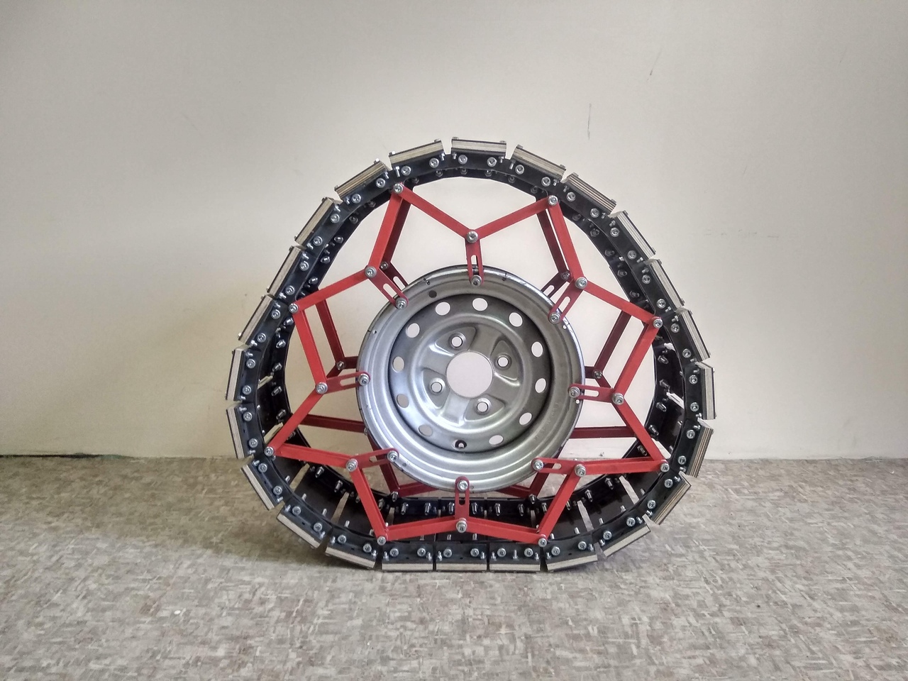 Гусеничное Колесо, Идея интересная, главное простая в исполнении. Вот только,на сколько хватит тросов? Ведь через них передается крутящий момент. Что то похожее было на автосалоне в Москве. Там правда было представленного колесо. Внутри которого,вместо камеры,находились резиновые жгуты(или полоски),часто соединяющие внутренний и внешний диаметр.