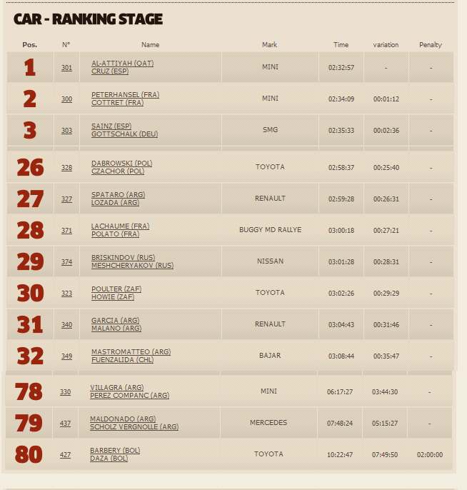 СALAMA – IQUIQUE (ИКИКЕ), связка 37 км, спецучасток 422 км. 1 300 – S. PETERHANSEL (FRA) MINI 04:17:53 ………………………………………………………………………………. 20 327 - EMILIANO SPATARO (ARG) RENAULT +01:15:35 340 - JOSE GARCIA (ARG) RENAULT нет данных, крайняя отметка на 5 точке (это середина этапа)