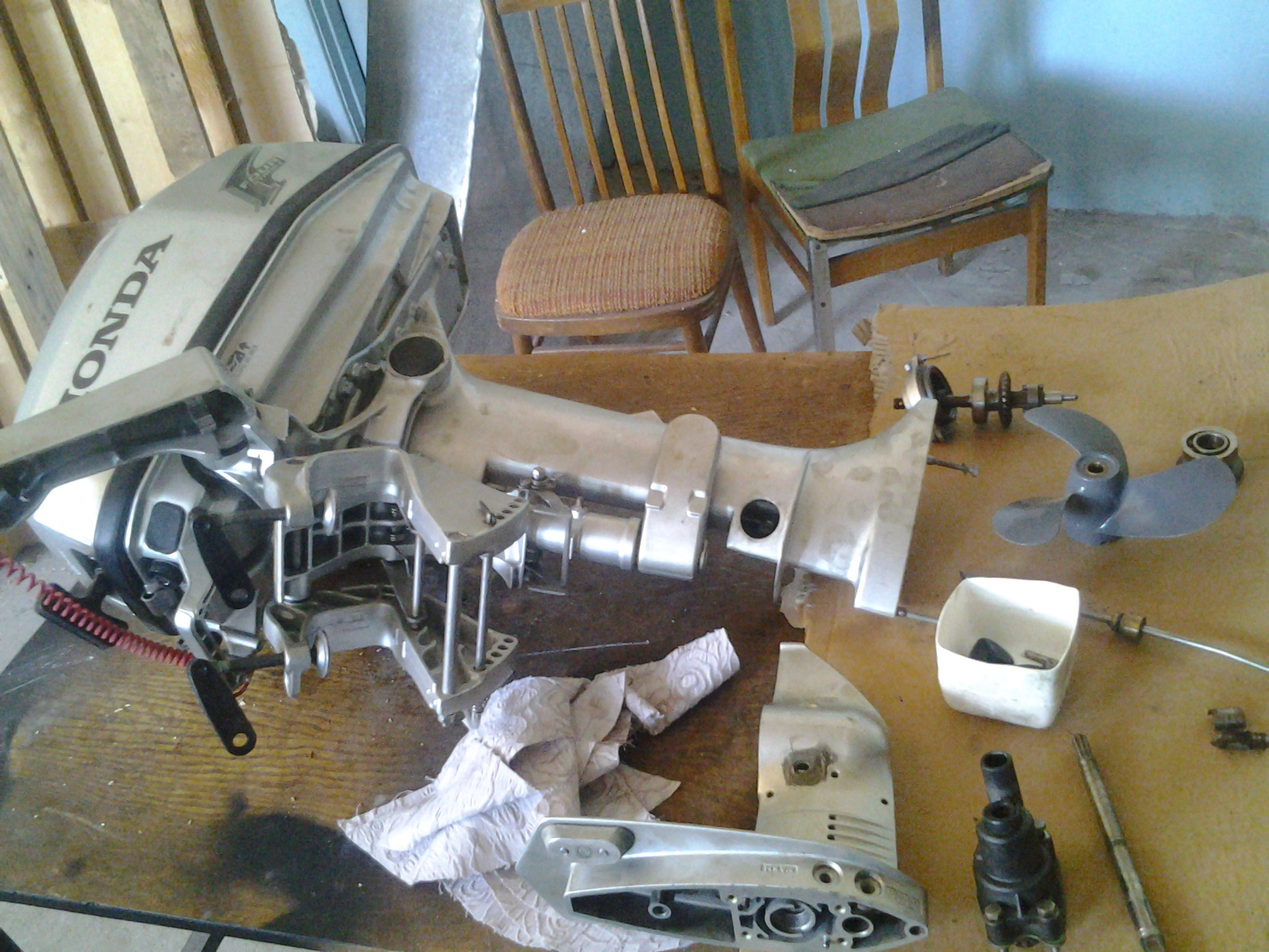 чего говорит.... фирма есть в москве торгующая запчастями хонда . но больно дорого все выходит : корпус менять надо . сальники только родные , похожих нет , ну подшипники можно найти за три копейки , вал менять надо тоже по хорошему , ну или имея новый корпус со стулкой попытаться его проточить , в нутри у него под вал запресована была втулка , которую разбило и протачивать и новую прессовать токаря не берутся , тк непонятно к чему привязываться по размерам . Вообще странная конструкция . вал на входе в редуктор не имеет шарикового подшипника . только втулка скольжения .