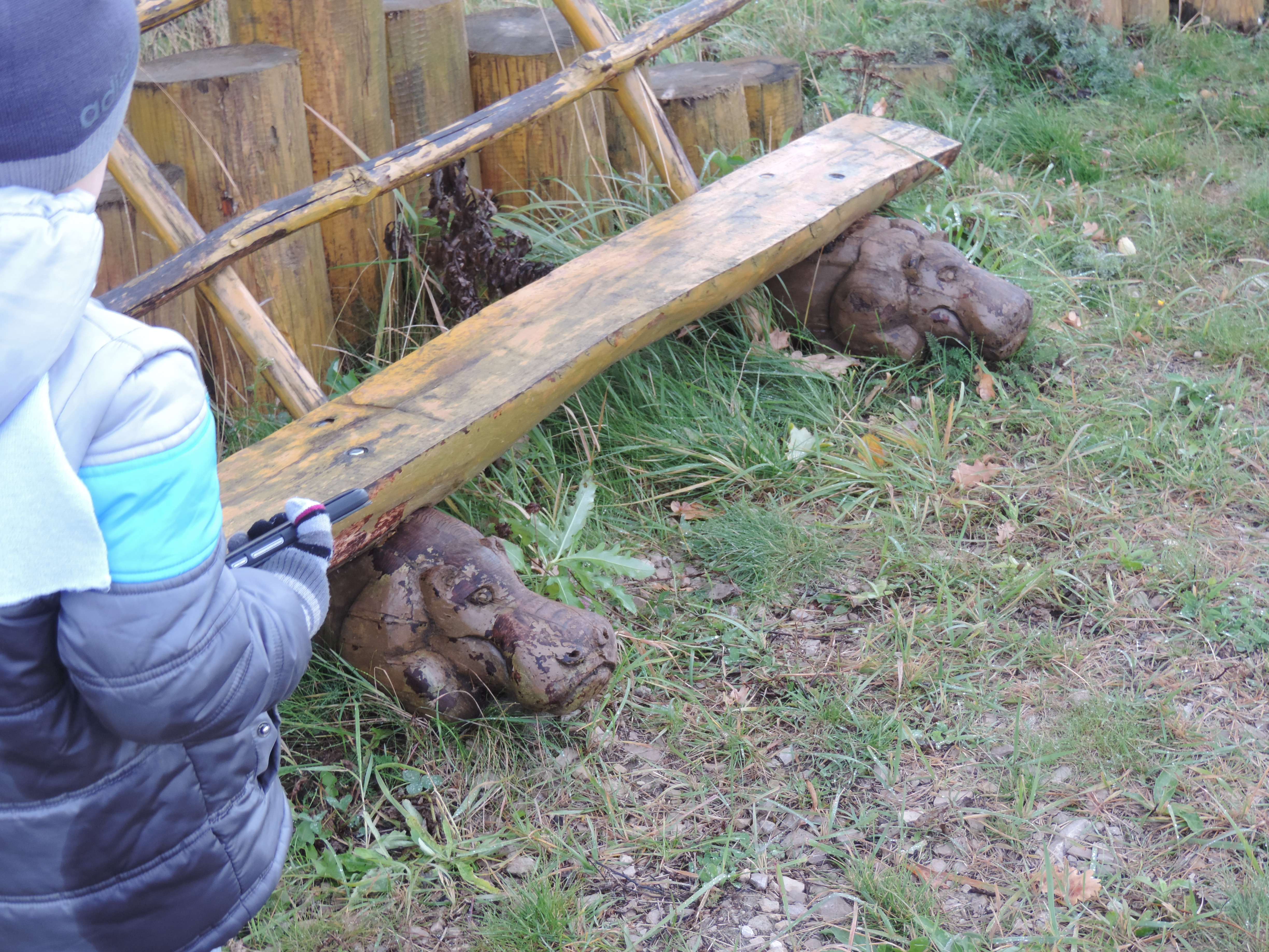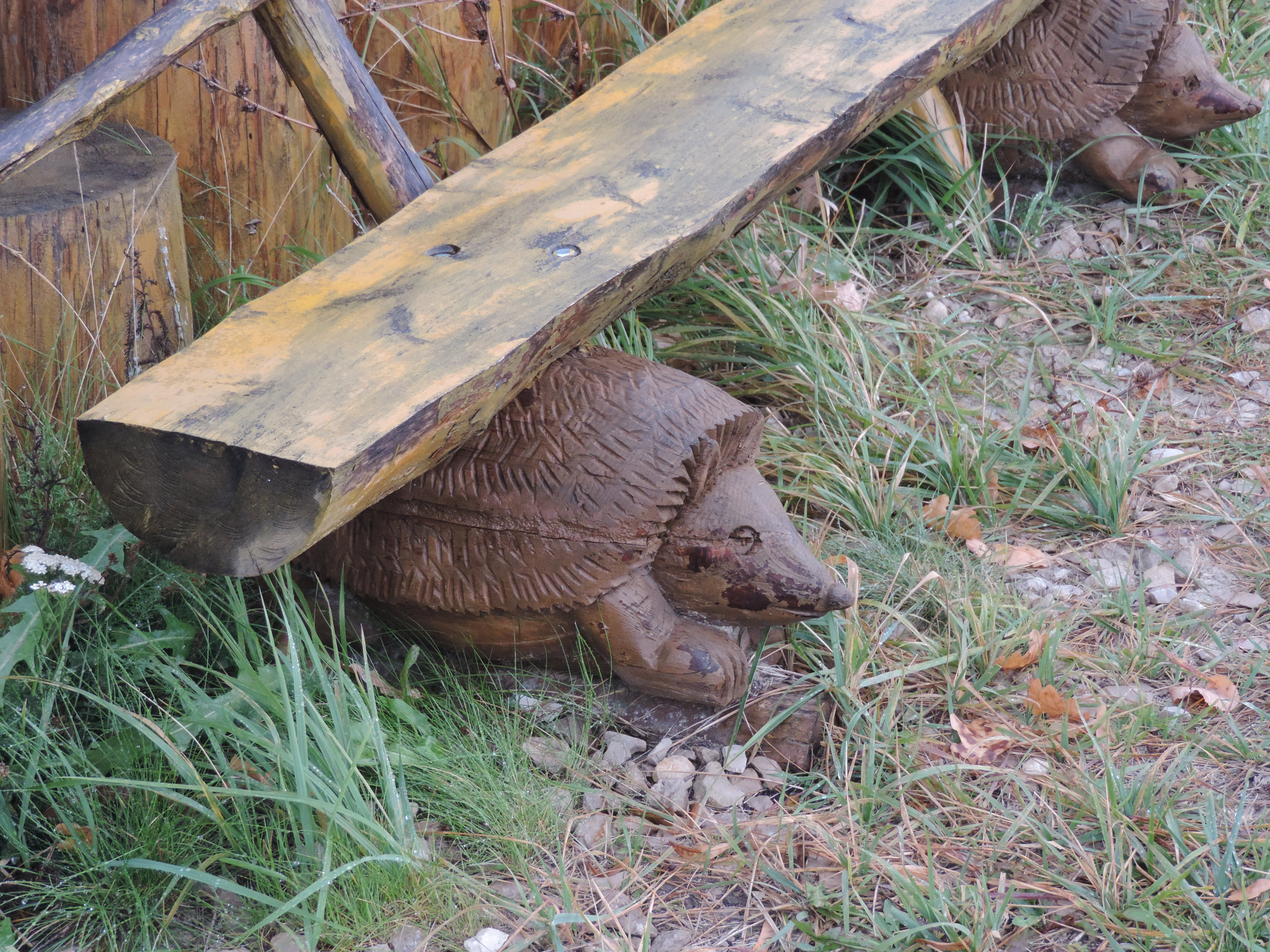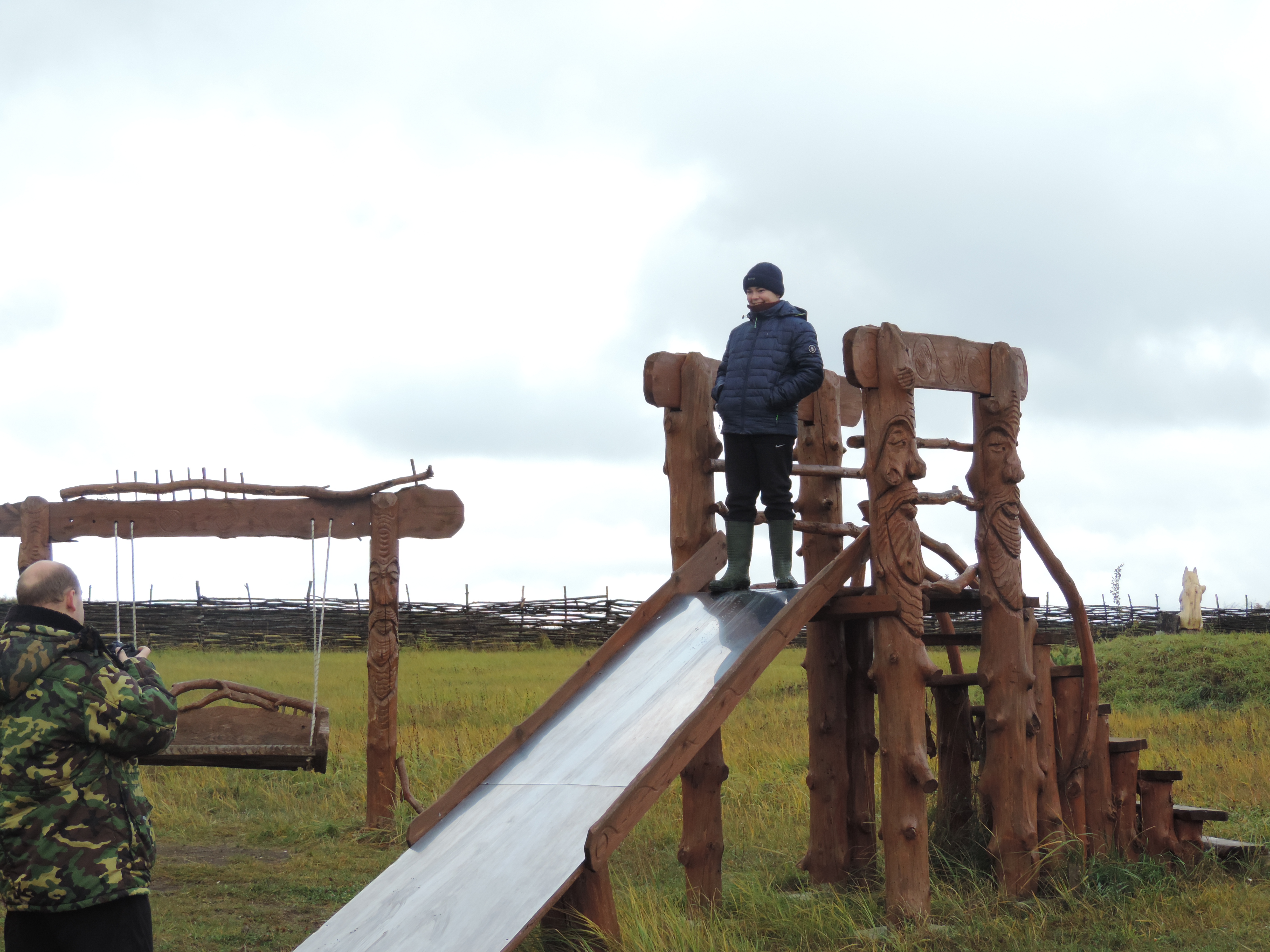 На территории много фигур из дерева и построек из дерева