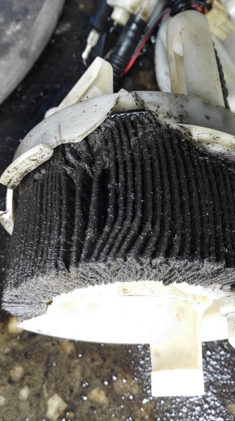 Пробег чуть более 200 000 км. Заправки где угодно. Стал плохо тянуть на скорости. Сетка чистая, а вот сам фильтрующий элемент, который замурован в корпус... Корпус был вскрыт с помощью отвертки и молотка. ![]() ![]()