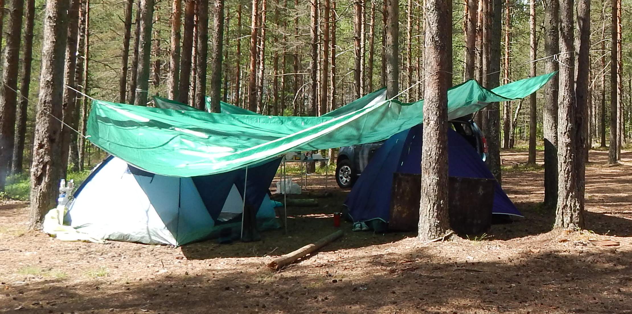 Мы используем пару тентов 4х6 метров плотностью 120гр/м, материал тарпаулин, с люверсами через каждый метр. Один раскрываем над палатками. Привязываем к деревьям, вместо одного дерева можно использовать Дастер. Палатки ставим входом в центр. При этом даже в старых однослойных палатках сухо. Второй над кухней-столовой (это по желанию, достаточно и одного тента на самом деле).
