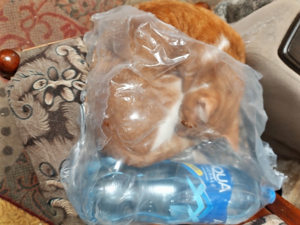 Наш котик Вася очень любит устраивать норки из любых пакетов. Вот как он устроился в почти пустой упаковке от минералки.