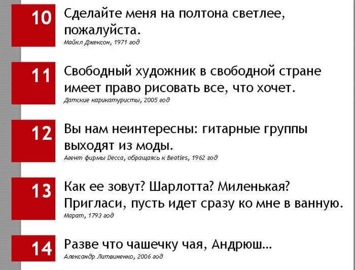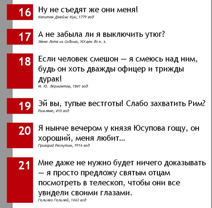 - Настоящий водитель не должен считать, сколько прохожих он задел по дороге. Дело водителя - вести машину, а не забавляться статистикой! - Русский народ не имеет плана действий. Он страшен своей импровизацией... - Родители хотели чтобы из меня вышел толк... Так и получилось, толк вышел... бестолочь осталась. |