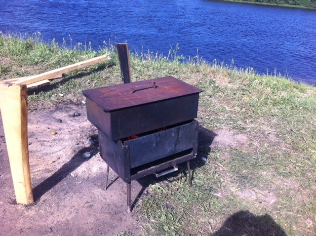 Сегодня был сильный ветер, поэтому сделал так. Один бок (видно на фото) прикрепил повыше для тяги снизу, а вторую боковину как положено в штатное место. Образуется отверстие вверху и огонь обнимает дно коптильни.