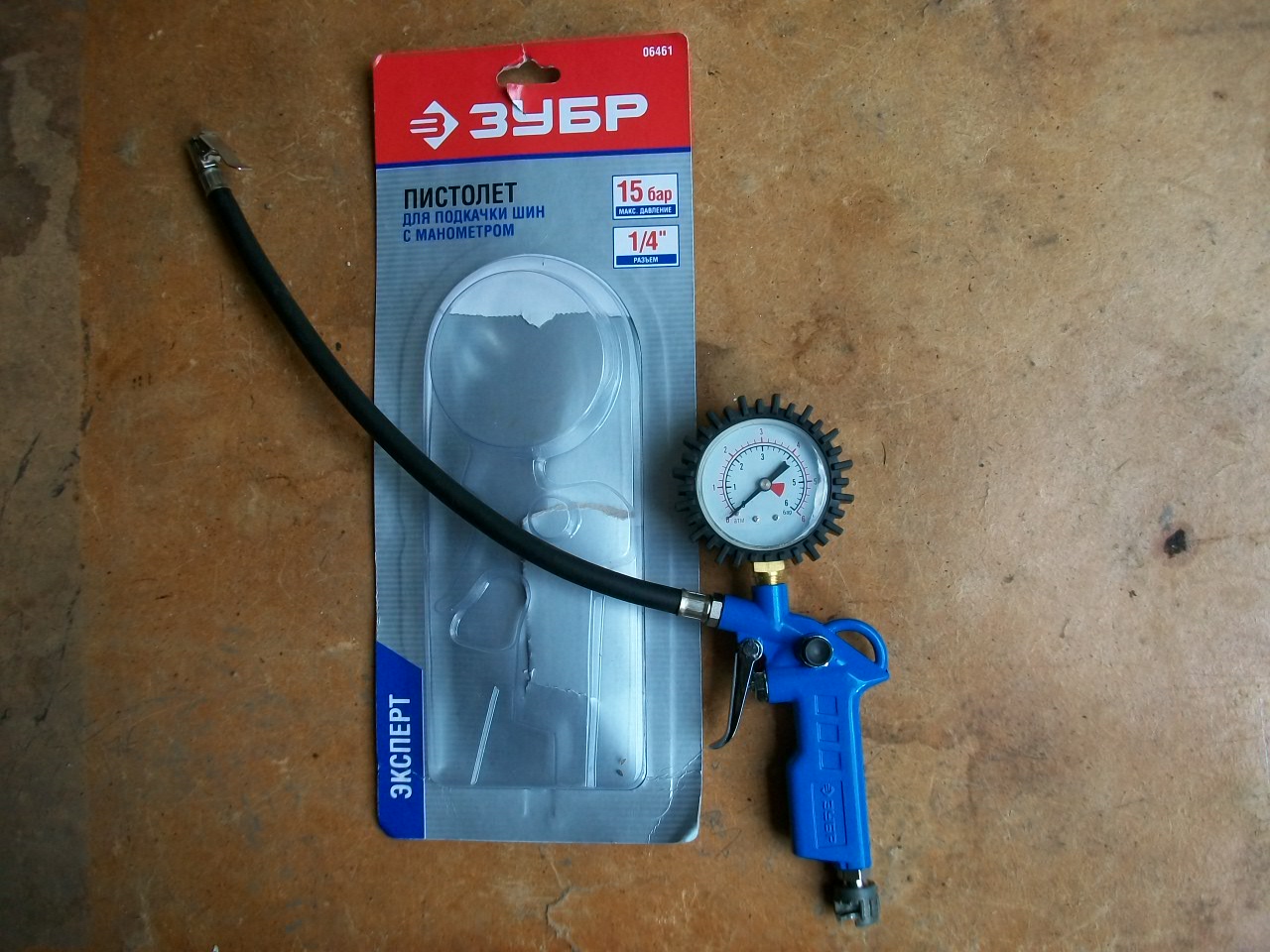 Поскольку у меня в гараже есть небольшой стационарный компрессор (переделанный из холодильного агрегата), то прикупил и такую игрушку. Что примечательно - манометр имеет предел 6 атм., поэтому наши давления укладываются во вторую треть шкалы - наиболее точного диапазона измерений. (450р)