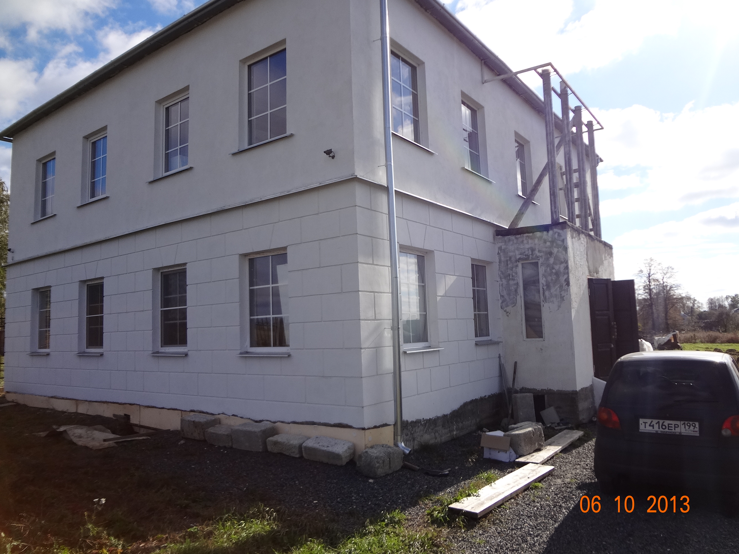 Продолжение, немного фасада, отливы, карнизы, водостоки, пристроенное крыльцо, вырытый и залитая заготовка под фонтан, начало отделки внутри, кухня комнаты...