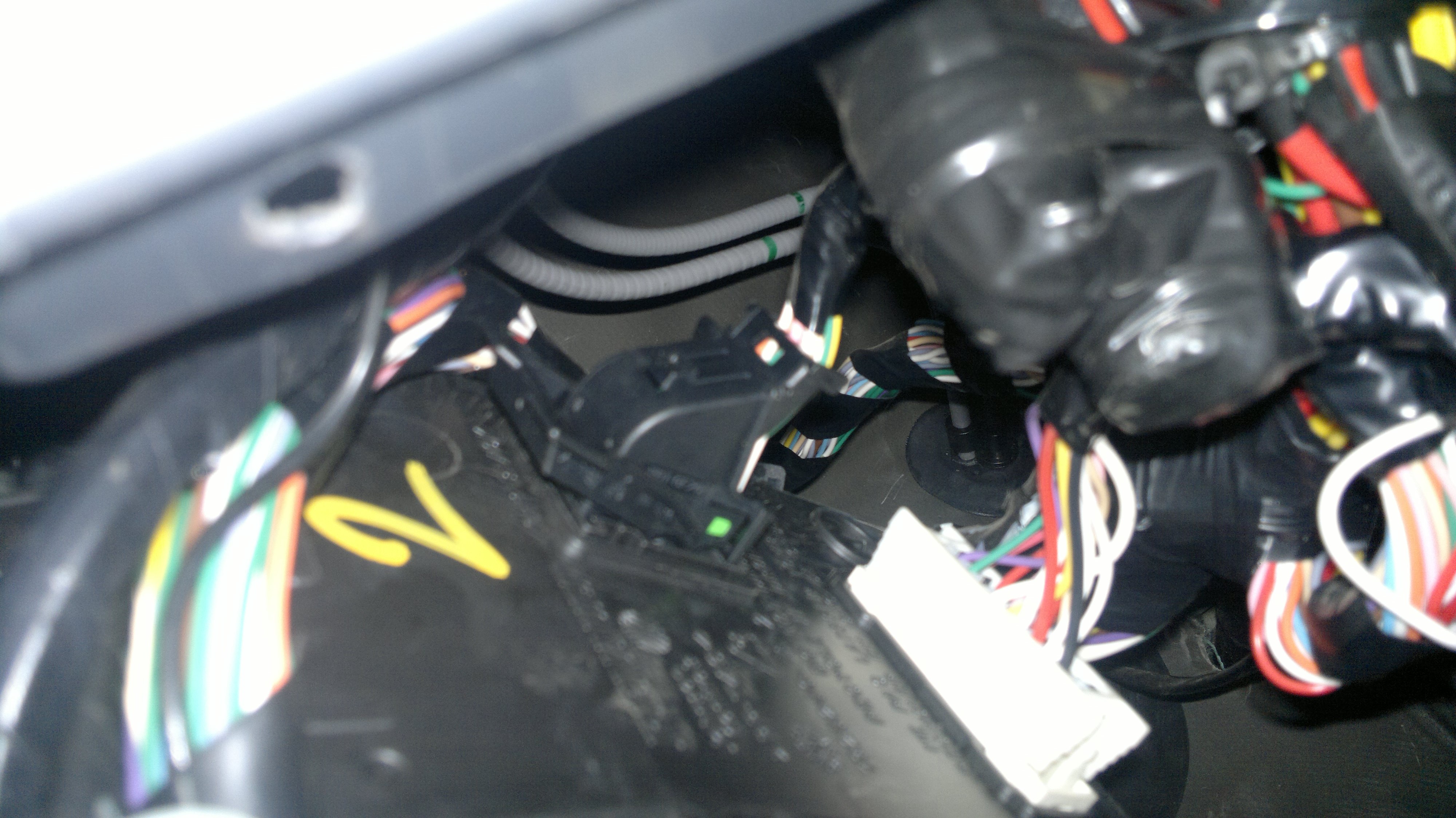 Вчера на Сашин авто установили и частично опробовали... Для установки потребовалось: ключ рожковый на 10, китайский инструмент для снятия клипс и пистонов, ключ торкс на 15, паяльник, немного флюса и олова, кусачки, нож для снятия и зачистки изоляции (можно использовать разъемы Scotchlok, на будущее наверно приобрету 10 пусть лежат на всякий случай). Все остальное имеется в комплекте с девайсом Приступаем к установке девайса: Для удобства снимаем панель приборов (подробнее про снятие кожуха рулевой колонки и снятия самой панели приборов описано выше Пересвет панели приборов - часть I). Снимаем нижнюю "защиту" педального узла сняв 5 пистонов. Отстыковываем разъем с педали управления дроссельной заслонкой (педаль "газа") аккуратно нажав на фиксаторы по торцам разъема Подключаем переходной жгут (между педалью акселератора и разъемом штатного жгута). Жгут в пластиковой гофре (именно такой имеется в наших комплектах) выводим в район панели приборов. Подключаем девайс согласно прилагаемой в комплекте схемой Стыкуем жгут проводов из комплекта к девайсу (предварительно обматываем жгут изолентой из комплекта по всей длине оставляя свободными концы, примерно 10...20 см для подключения)... Приступаем к подключению. Для удобства отстыковываем разъем педали тормоза нажав на фиксатор разъема посередине... Для подключения, протаскиваем штатный жгут в зону приборной панели (так удобнее, желающие могут заняться акробатикой и не снимать панель приборов) Защищаем изоляцию зеленого провода (1 контакт) и подключаем коричневый провод жгута девайса, опаиваем и изолируем. Возвращаем разъем из зоны установки приборной панели к его родному месту прибывания и подключаем к педали тормоза. Аналогичным образом отключаем разъем с педали сцепления, подключаем зеленый провод жгута девайса к зеленому проводу жгута сцепления (2 контакт на разъеме). Подключаем разъем в штатное место. С педалями окончили, приступаем к подключению девайса (желтый провод жгута) к сигналу датчика скорости (контакт А6 коричневой колодки разъема коммутационного блока салона). Коммутационный блок салона расположен с левой стороны водителя, в районе "левой коленки" Отстыковываем колодку разъема нажав на фиксатор и опустив фиксирующую скобу (см. фото) извлекаем колодку. Аккуратно нажав на фиксатор извлекаем из колодки коричневый разъем (так ИМХО удобнее монтировать). Подключаем желтый провод жгута девайса к белому проводу (6-й контакт коричневой колодки коммутационного блока салона), опаиваем, изолируем и подключаем на свое место. Переходим к подключению питания. Питание решено было взять под панелью приборов. Землю (черный провод жгута девайса) подключил тут же под панелью приборов. Зачистил провод, примерно, на 3 см, скрутил колечком вокруг мощной отвертки, опаял. Открутил гайку ключом на 10 накинул полученную петельку и завернул гайку. +12 В взял после замка зажигания. Подключался к жгуту идущему на правый подрулевой переключатель (управления омывателем и дворниками). Подключил красный провод жгута девайса к желтому проводу разъема правого переключателя, опаял, за изолировал. Переходим к установке индикатора режимов (светодиод). Решил установить в панель приборов с индикацией символа GAS, в штатном режиме данный индикатор не используется и не активирован. Так как панель у нас уже снята, остало
