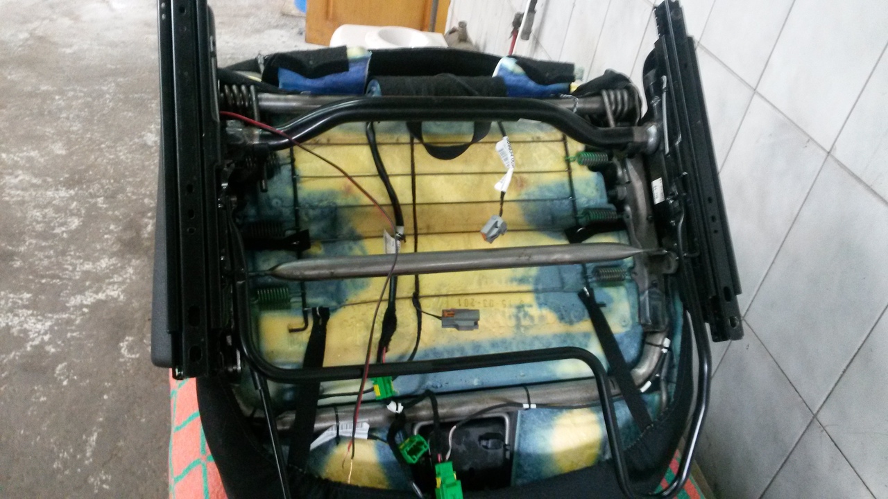Сняли сидение....намучались с разъемом черно-красным... Но в инет не полезли, решили сами "сломать его полностью". В итоге победа. Вот так оно выглядит снизу, жопная часть Вот так выглядят внутренности спинки... Вообщем скажу сразу. Ни хрена не получилось снять чехол ( заводской ) спинки.. Это такой гемор... Вроде все колечки поотсоединяли, все что вытащить смогли.. Но уперлись в обогрев сидения и еще там внутри какие-то хрени.. Вообщем решил я не рисковать. Всё собрали обратно. Единственное, это под жопную часть, под пружины между пружинами и паралоном сидения просунул, аккуратно вырезанный по размеру нижней подушки, ворсовый коврик, чтоб сидеть было жестче, вес у меня не маленький, за 2 года продавилось мальца. Как бы всё. п.с. кто не знает про "поломай меня полностью" - смотрите