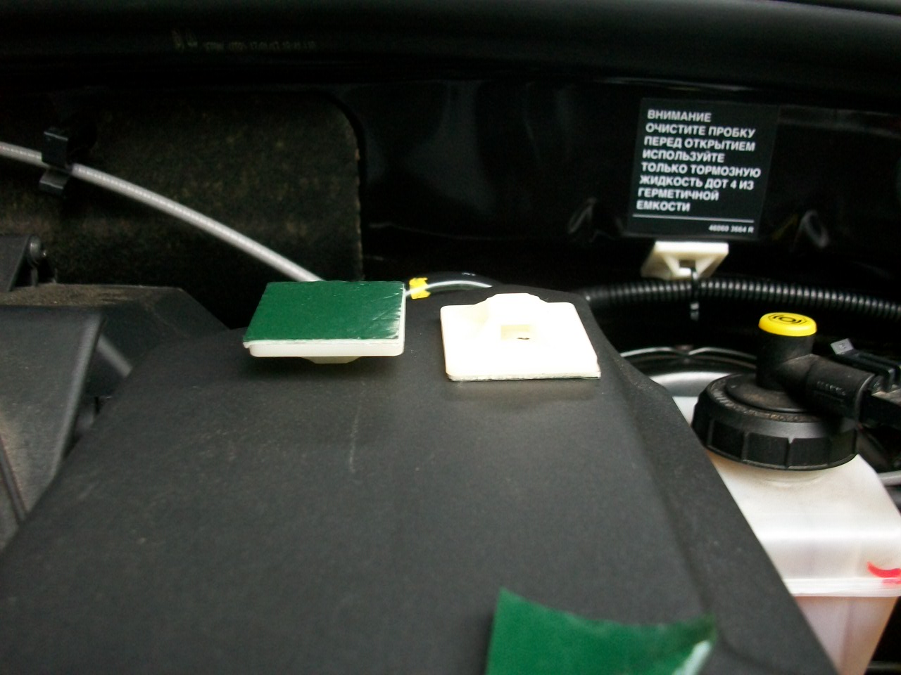 Протяжка проводов (+ аккумулятора) в салон, для авто с электронной педалью. Часть провода прошла в родной гофре, часть в проложенной заново. Отверстие из подкапотного пространства в салон закрыто заглушкой. Аккуратно вынуть заглушку, проложить провода, лучше в гофре. Чтобы проводка не тёрлась об вакуумный усилитель тормозов, закрепил её на липучках с хомутами. В отверстие кузова проводка проходит через резиновую прокладку (ножка компрессора бытового холодильника - имеет паз). Плюсовой провод от аккумулятора снабжён предохранителем (пока 10ампер.)
