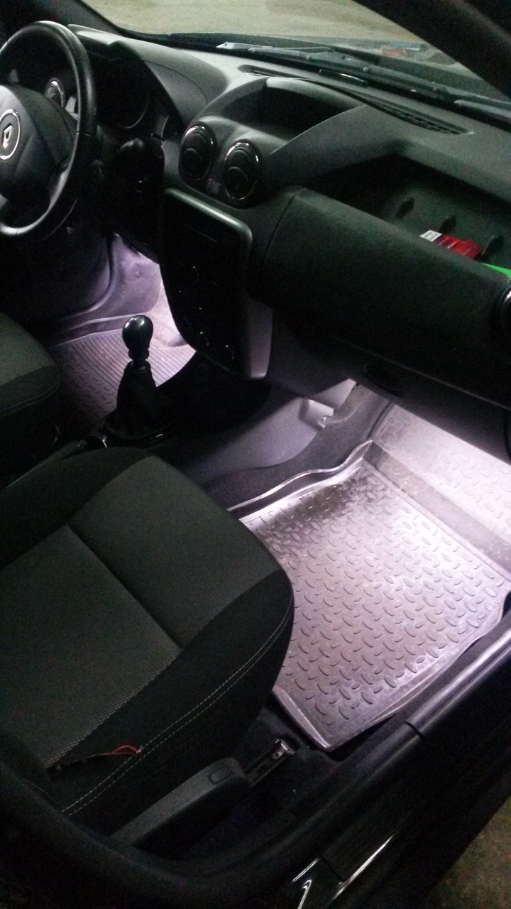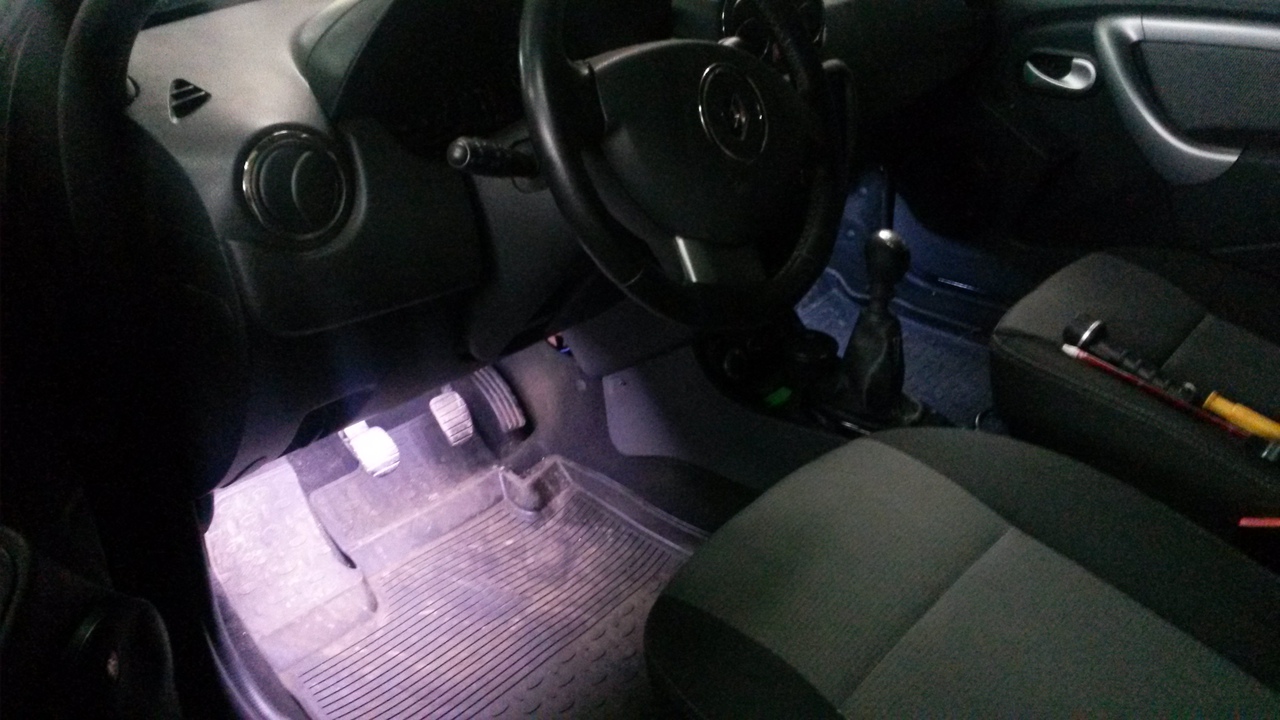 по 200 руб./шт И заменил подсветку в первый ряд, ибо старые полоски немного просели по свету и не так светили ярко, как хотелось бы... Замена заняла примерно 15 минут за обе. По сути надо было только провода перекрутить Для разницы свет в ногах водителя поменян, на пассажирском месте нет Да и световой спектр явно отличается по яркости. Для сравнения спереди свет новый, сзади по прежнему старый. Вот так ярко теперь спереди светит. ОГОНЬ !!!!