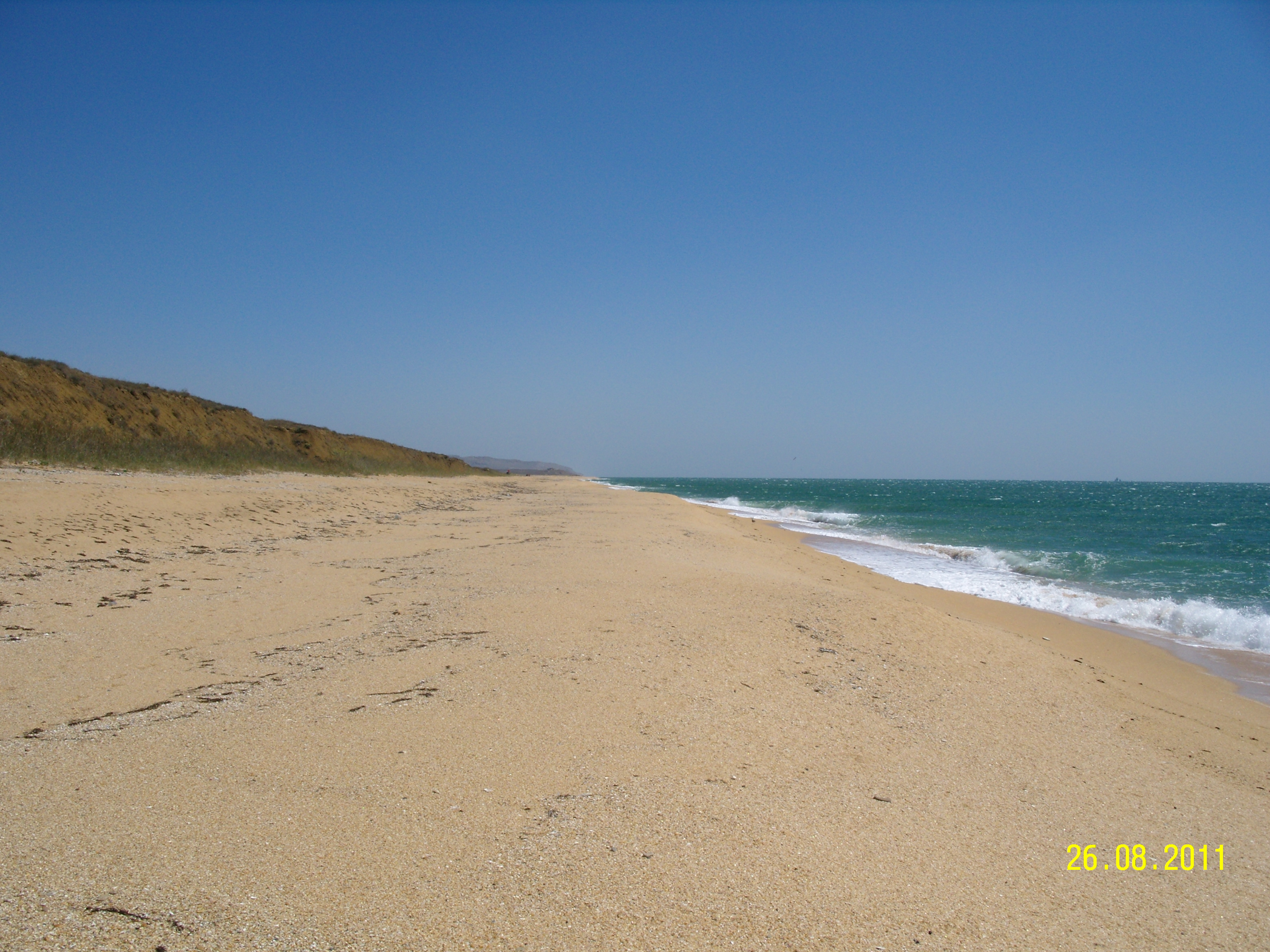 По полигону к берегу, сразу после окончания учений. Трава местами сгорела. На берегу полигона морской пехоты. Вид налево. Там где обрыв заканчивается, стоят бочки и красный флаг, обозначающие восточную границу участка высадки десанта. Вид направо. Через пару часов БДК отчалил и ушёл на Восток. |
