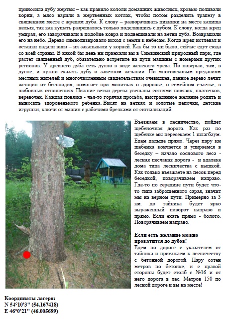 О том, случаются ли на свете чудеса, спорить, наверное, излишне. Случаются. В жизни тех, кто в них верит. Немало на свете и таинственных, обладающих необъяснимой силой мест. Мордовия – не исключение. Одно из таких мордовских «чудес света» - священные дубы в Большеберезниковском районе. Расположены они в Симкинском лесничестве за с.Симкино. Как гласит народная молва, дерево, которому, по подсчетам, не менее 500 лет, избавляет семейные пары от бесплодия, посылает им здоровых детей. Дуб, как мужское дерево, понятное дело, посылал в основном мальчиков. По легенде, в эпоху крещения мордвы закоренелые язычники не захотели принять новую веру, поэтому выбрали для своих обрядов тайное место. Возле дуба они совершали жертвоприношения и молились. В старину именно на этой поляне молились мордовскому Чамапазу. Нельзя обходить священное дерево трижды, иначе дуб не отпустит. На капище можно было только приносить, но ничего нельзя было брать, иначе можно заболеть или даже помереть. Мордва приносила дубу жертвы – как правило кололи домашних животных, кровью поливали корни, а мясо варили в жертвенных котлах, чтобы потом разделить трапезу в священном месте с жрецом дуба. К слову – разворачивать пикники на месте капища нельзя, так как кушать разрешалось только поделившись с дубом. К слову, когда жрец умирал, его заворачивали в подобие ковра и подвешивали на ветви дуба. Возвращали его на небо. Дерево символизировало исход с земли к небесам. Когда жрец истлевал и останки падали вниз – их закапывали у корней. Как бы то ни было, сейчас едут сюда со всей страны. В какой бы день ни приехали вы в Симкинский природный парк, где растет священный дуб, обязательно встретите на пути машины с номерами других регионов. У древнего дуба есть дупло в виде женского чрева. По поверью, там, в дупле, и нужно сказать дубу о заветном желании. По многовековым преданиям местных жителей и многочисленным свидетельствам очевидцев, данное дерево лечит женщин от бесплодия, помогает при молитвах о здоровье, о семейном счастье, в любовных отношениях. Нижние ветки дерева увешаны сотнями повязок, платочков, веревочек. Каждая повязка - чья-то горячая просьба, выстраданное желание родить и выносить здоровенького ребенка. Висят на ветках и золотые цепочки, детские игрушки, ключи от машин с рабочими брелками от сигнализаций. ![]()